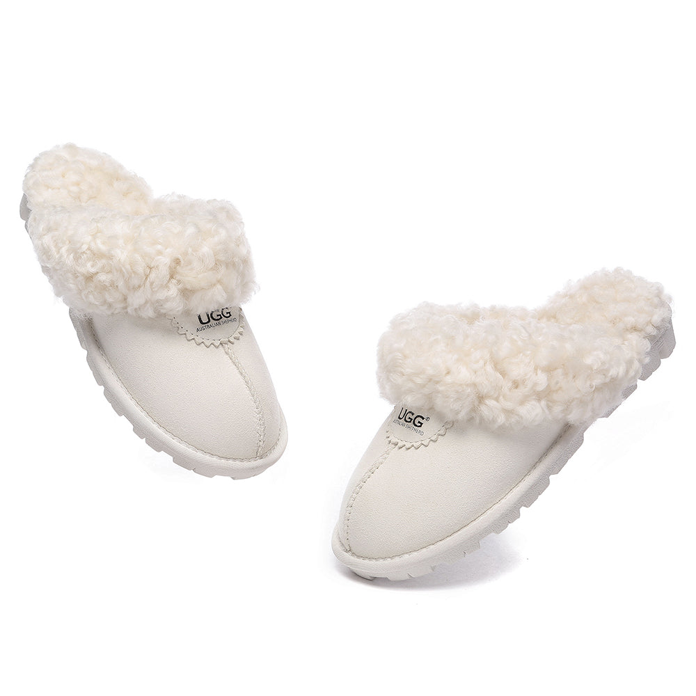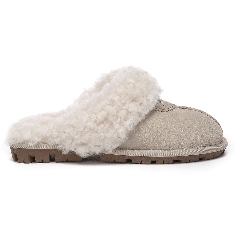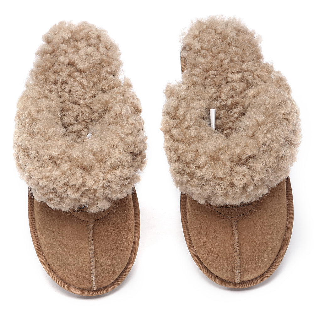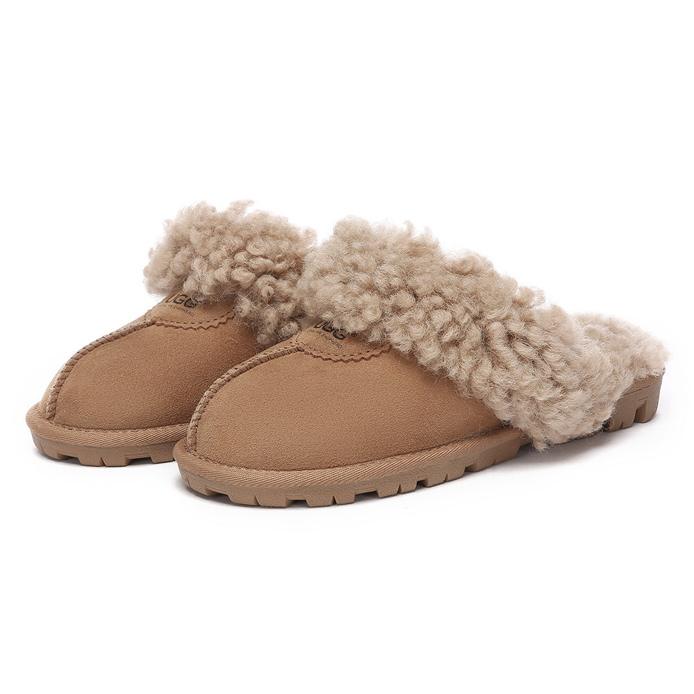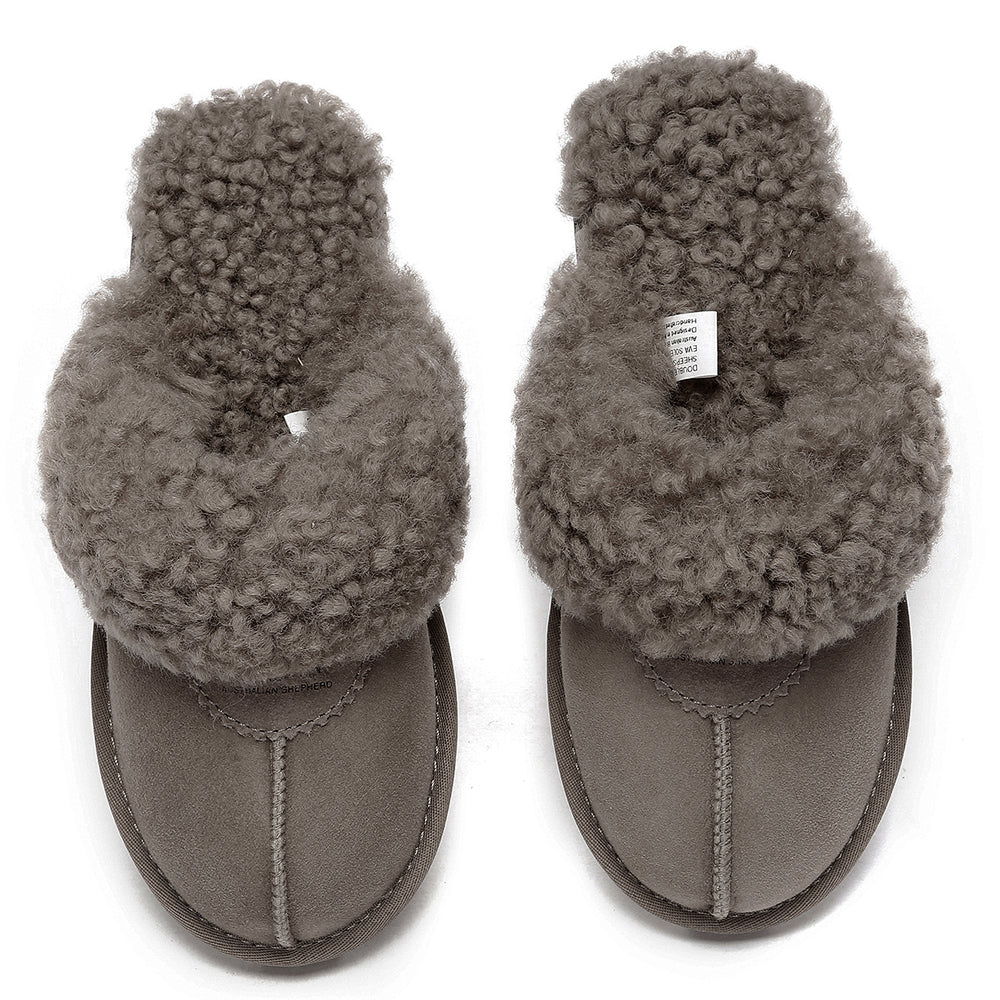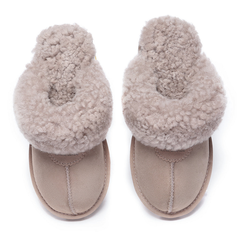 Discover the ultimate cosiness with the Australian Shepherd Waffle Curly Slippers, the most adorable style of the season. These slippers showcase a unique curly sheepskin wool collar which adds a touch of elegance and comfort. Effortlessly chic, these slippers are the perfect design for unwinding and kicking back in at home. With double-faced sheepskin that is dense and incredibly snug, you'll be wrapped in warmth no matter the hour.