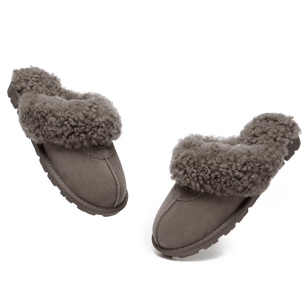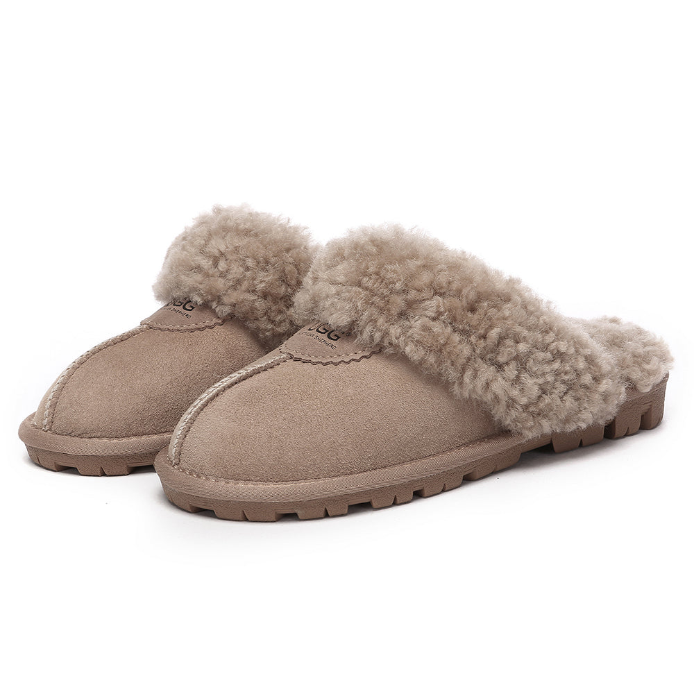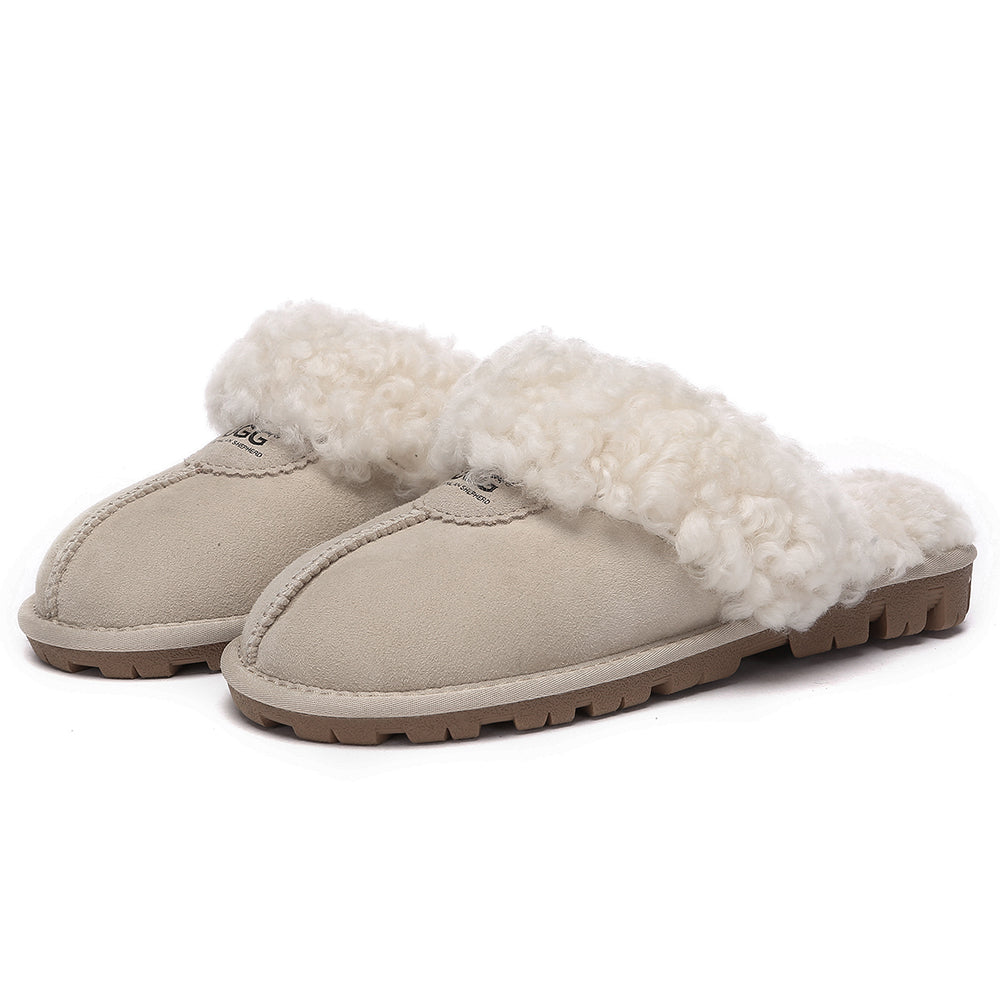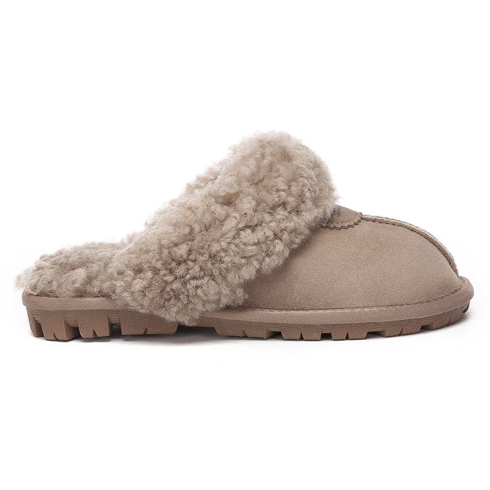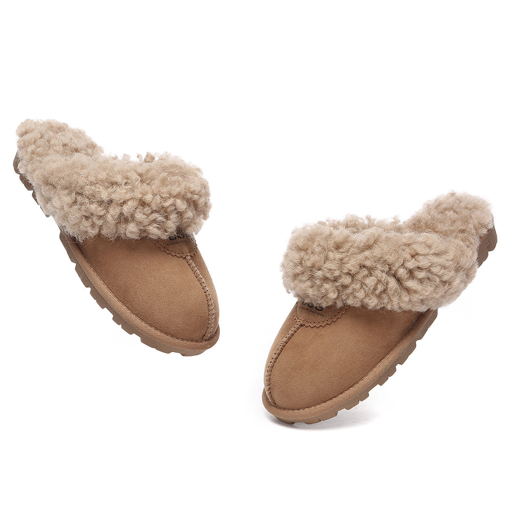 Discover the ultimate cosiness with the Australian Shepherd Waffle Curly Slippers, the most adorable style of the season. These slippers showcase a unique curly sheepskin wool collar which adds a touch of elegance and comfort. Effortlessly chic, these slippers are the perfect design for unwinding and kicking back in at home. With double-faced sheepskin that is dense and incredibly snug, you'll be wrapped in warmth no matter the hour.