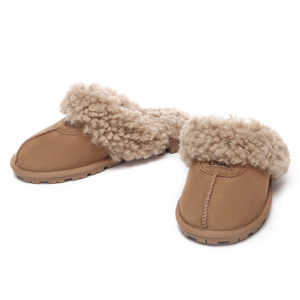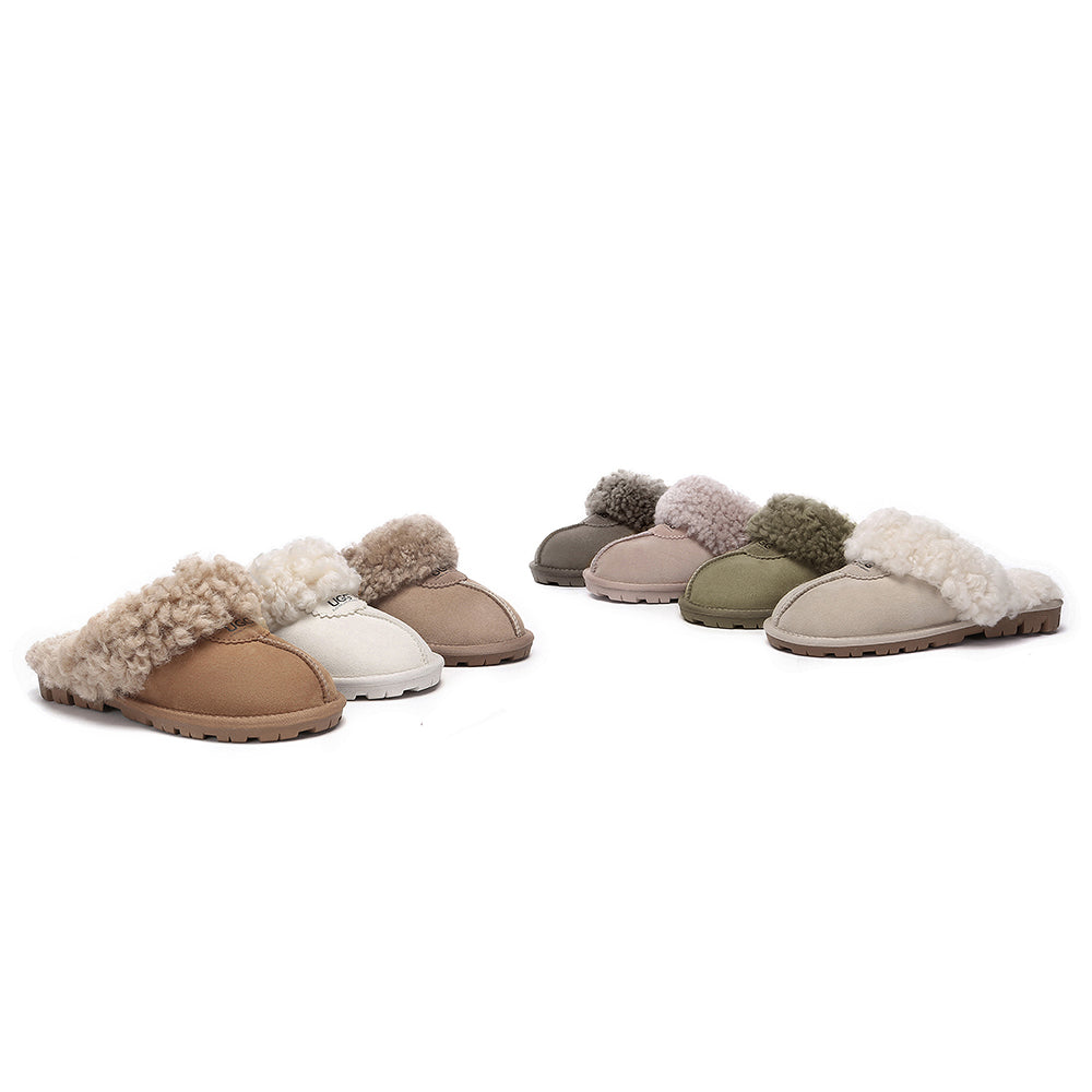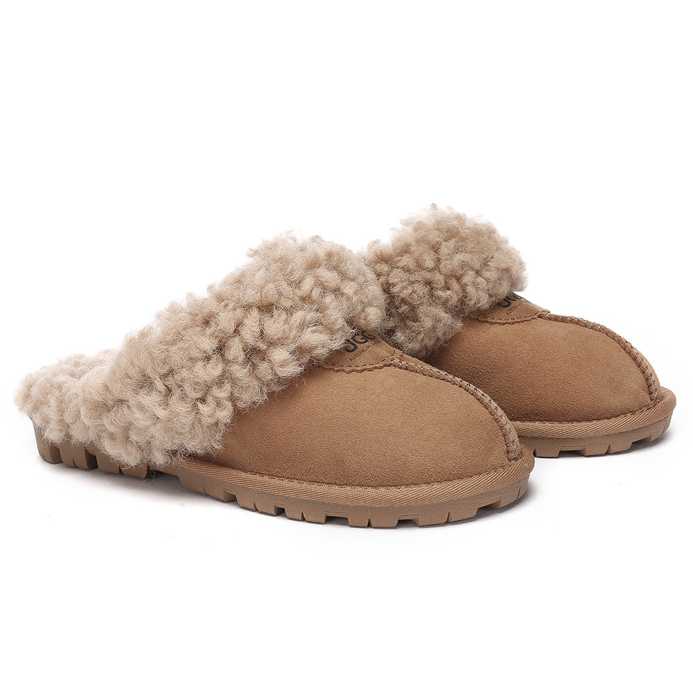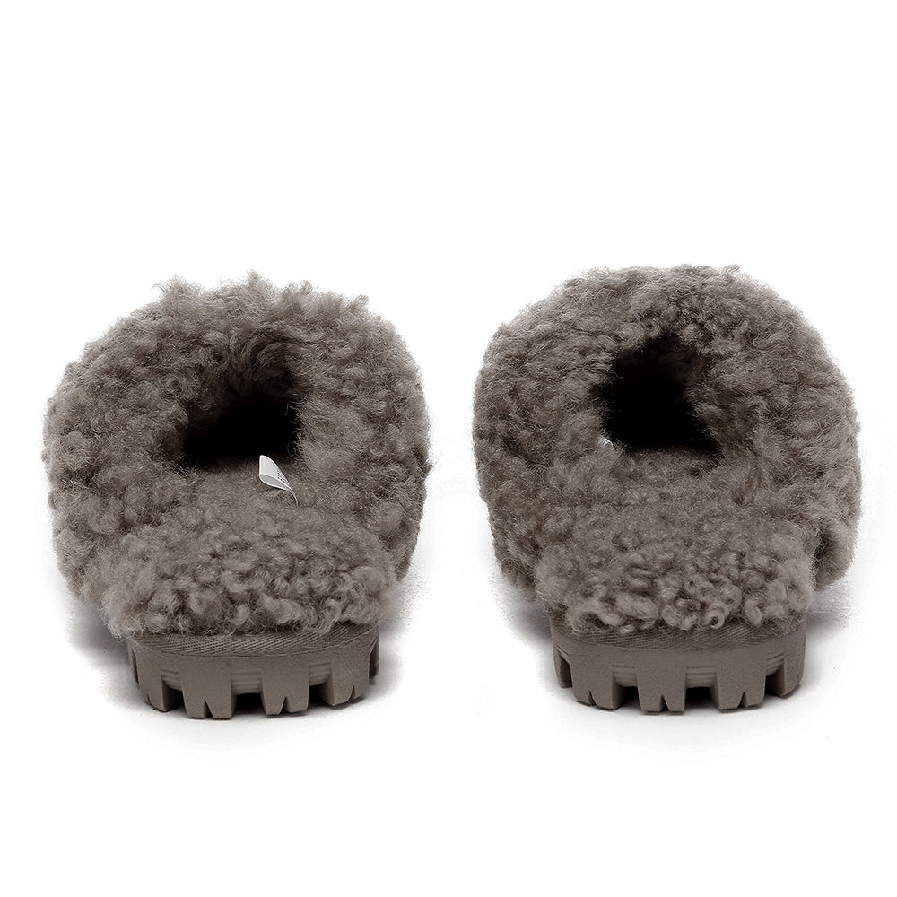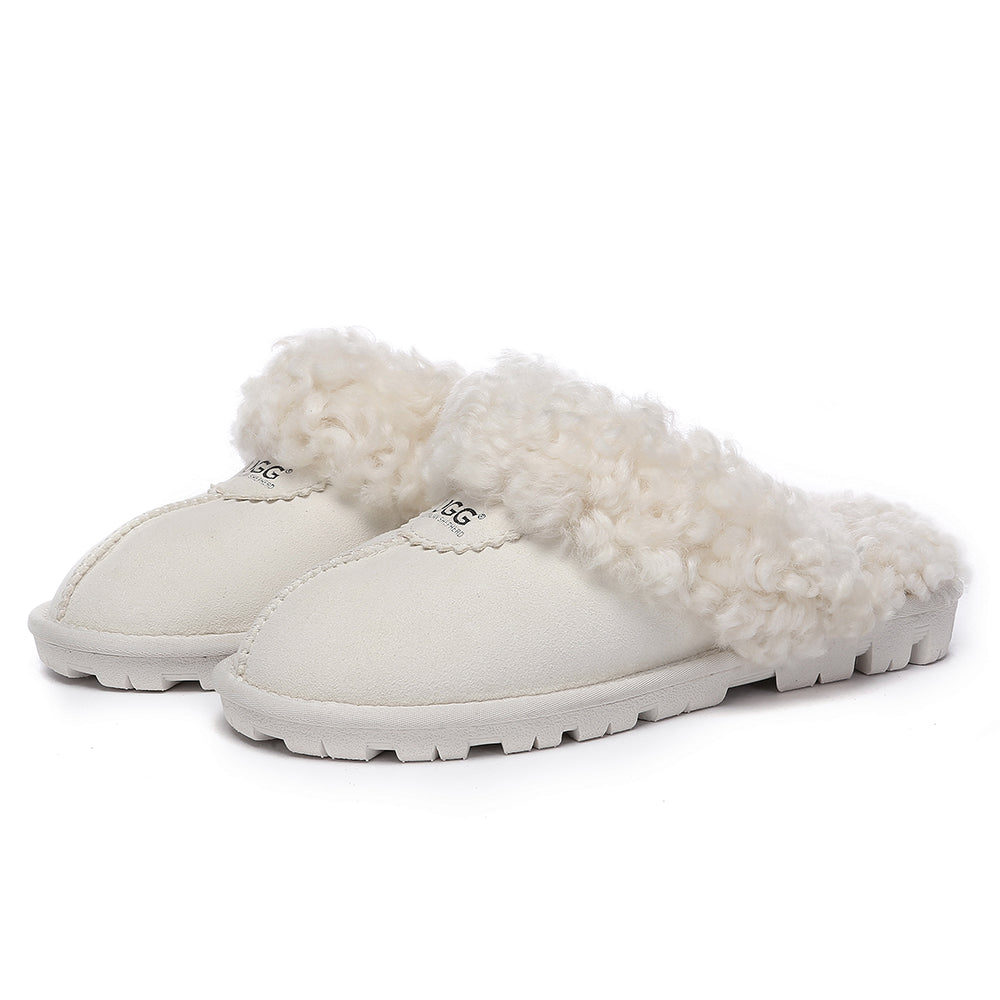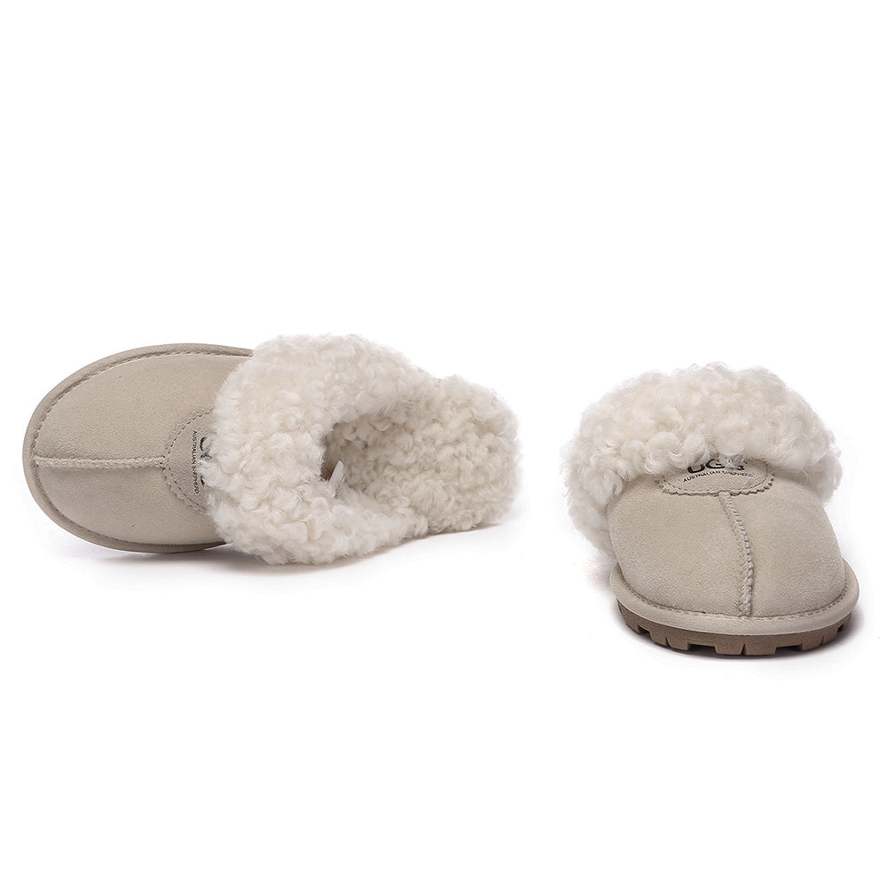 Discover the ultimate cosiness with the Australian Shepherd Waffle Curly Slippers, the most adorable style of the season. These slippers showcase a unique curly sheepskin wool collar which adds a touch of elegance and comfort. Effortlessly chic, these slippers are the perfect design for unwinding and kicking back in at home. With double-faced sheepskin that is dense and incredibly snug, you'll be wrapped in warmth no matter the hour.