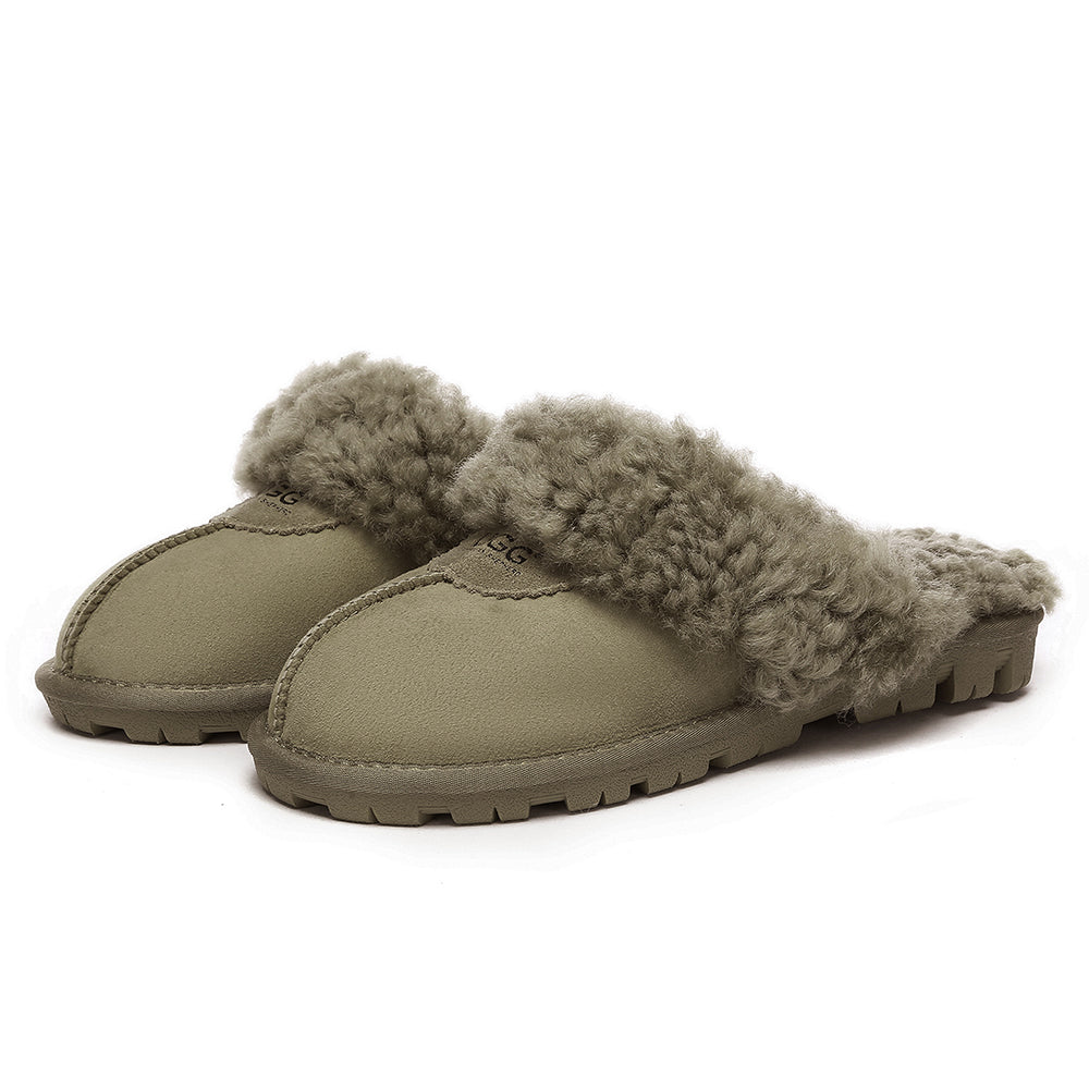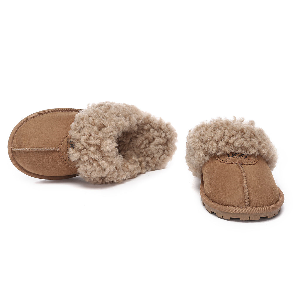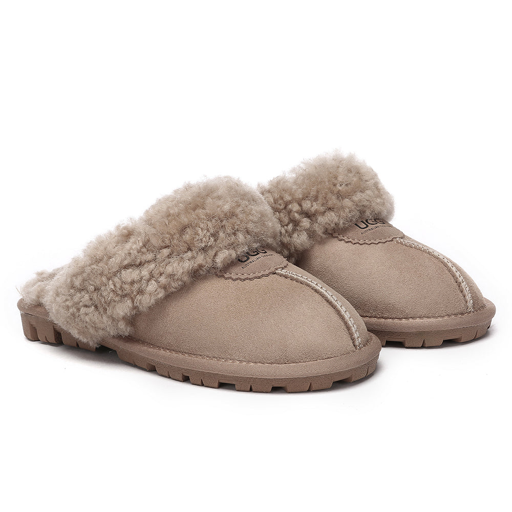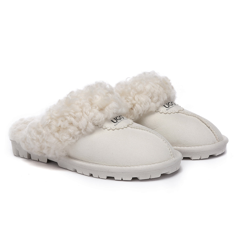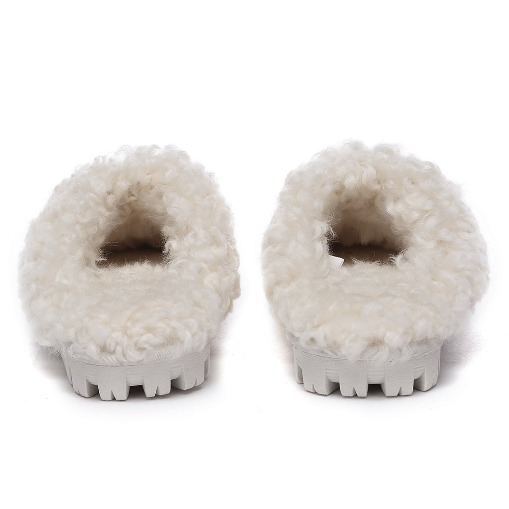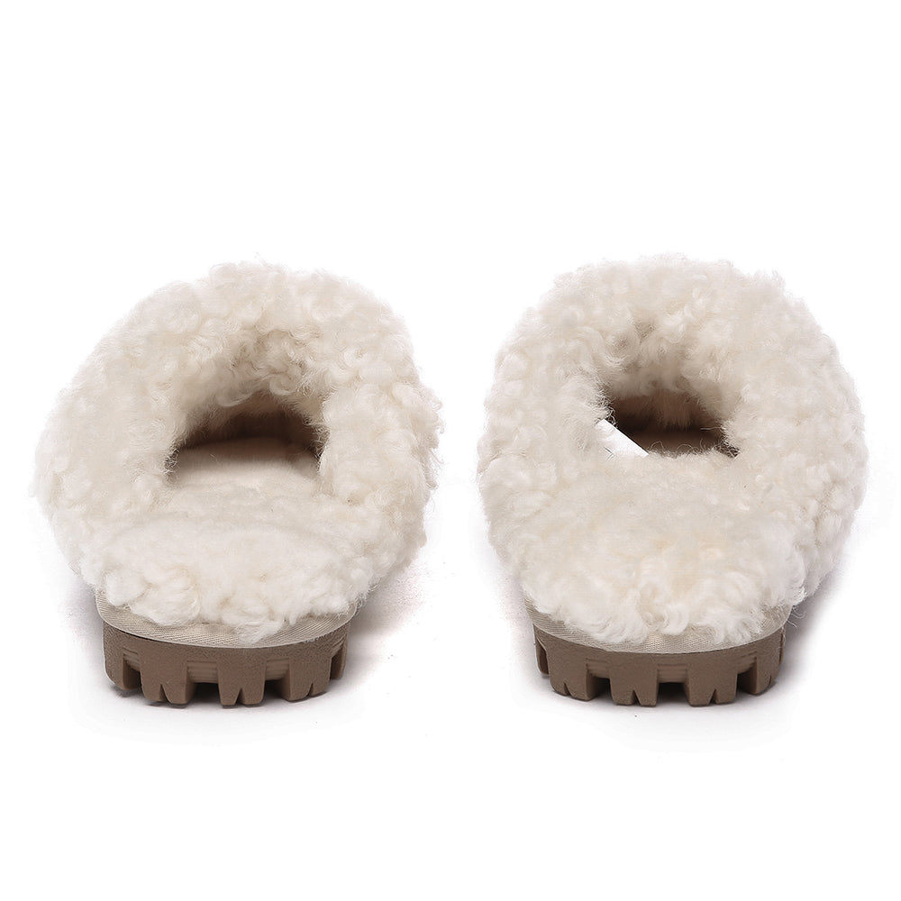 Discover the ultimate cosiness with the Australian Shepherd Waffle Curly Slippers, the most adorable style of the season. These slippers showcase a unique curly sheepskin wool collar which adds a touch of elegance and comfort. Effortlessly chic, these slippers are the perfect design for unwinding and kicking back in at home. With double-faced sheepskin that is dense and incredibly snug, you'll be wrapped in warmth no matter the hour.