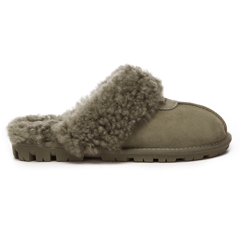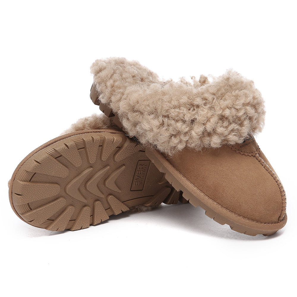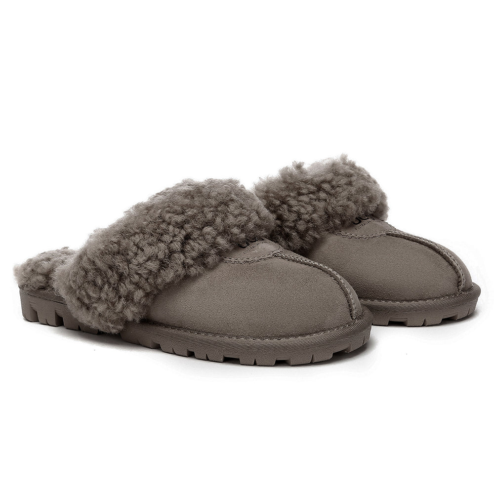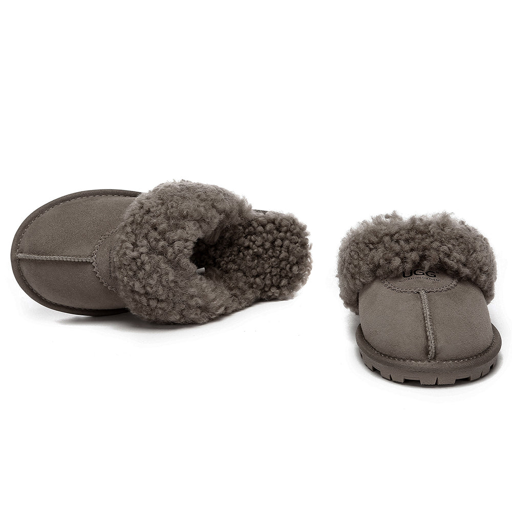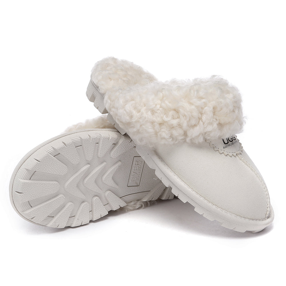 Discover the ultimate cosiness with the Australian Shepherd Waffle Curly Slippers, the most adorable style of the season. These slippers showcase a unique curly sheepskin wool collar which adds a touch of elegance and comfort. Effortlessly chic, these slippers are the perfect design for unwinding and kicking back in at home. With double-faced sheepskin that is dense and incredibly snug, you'll be wrapped in warmth no matter the hour.