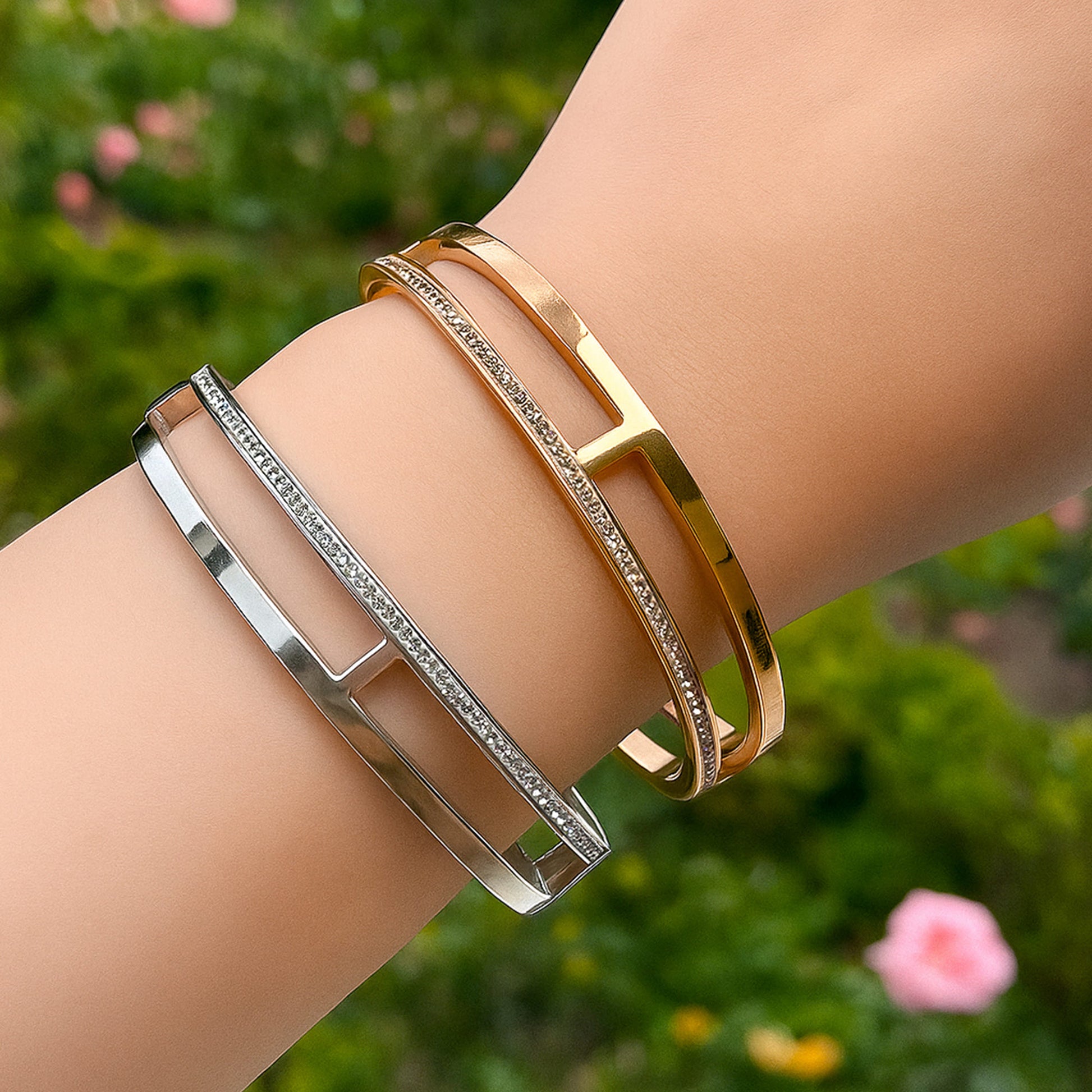 A beautiful piece with a slightly edgy edge, the Lucky Dimension Cuff Bangle was made of a luxurious 18ct Rose Gold layered stainless steel. The sparkling cubic zirconias adorned on this bangle adds an elegant and modern twist to the traditional bracelet design. This cuff bangle features a side hinged locking closure for easy wearing and removal. Add this masterpiece to your jewellery collection now for that instant touch of class to your wardrobe!