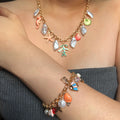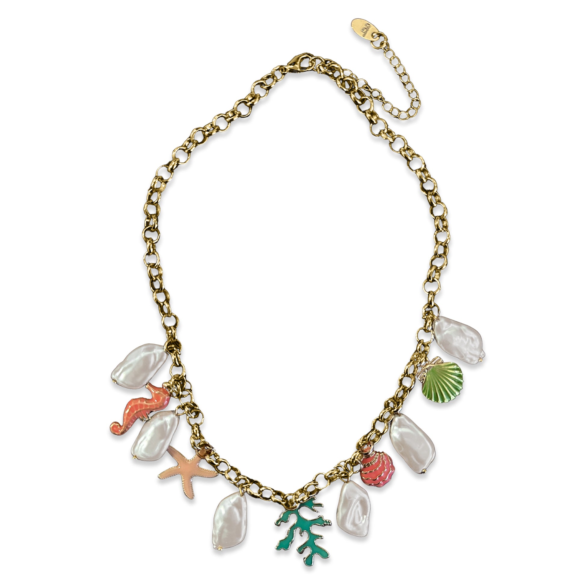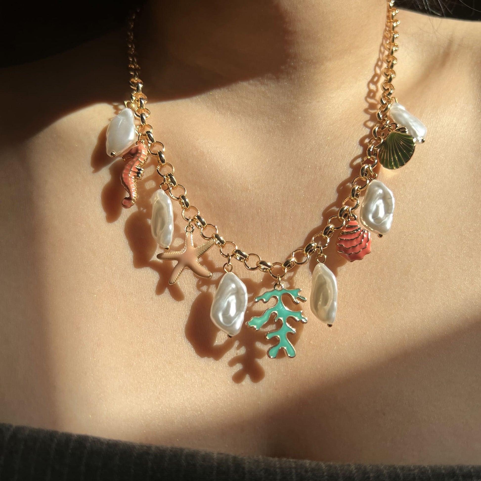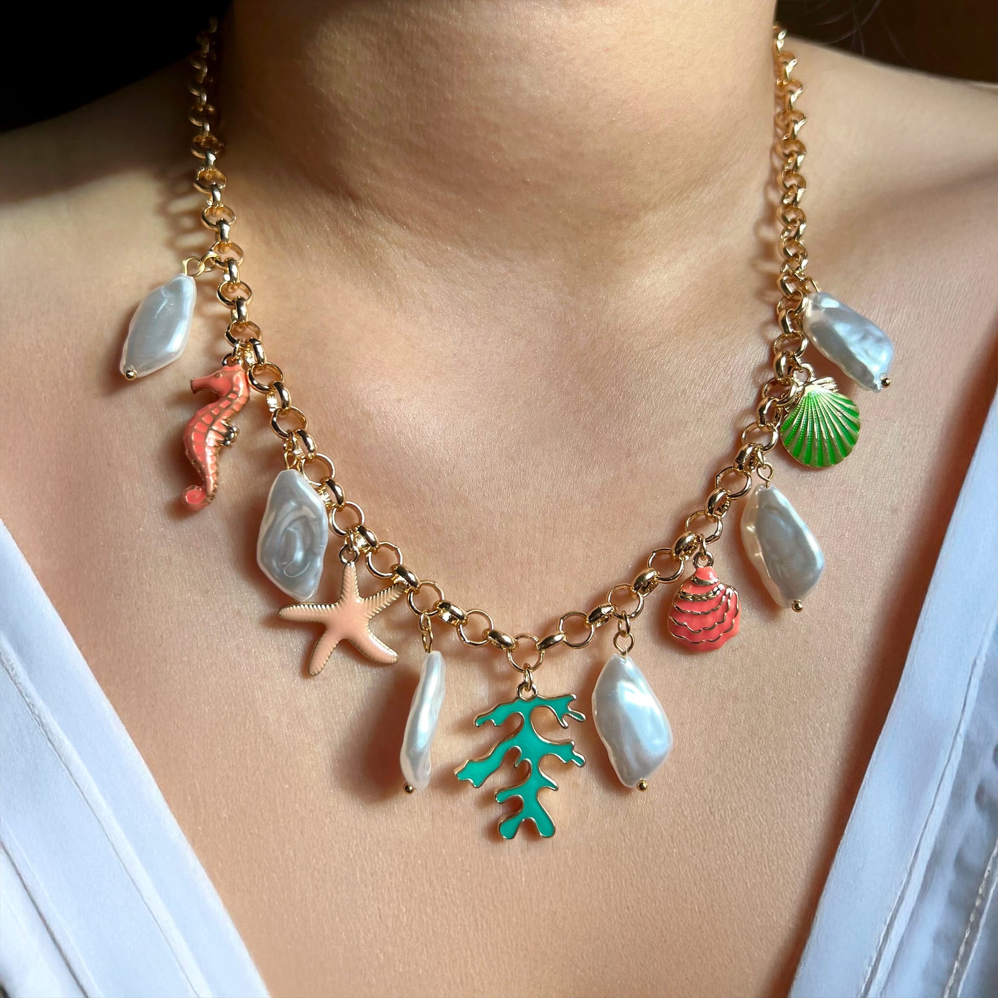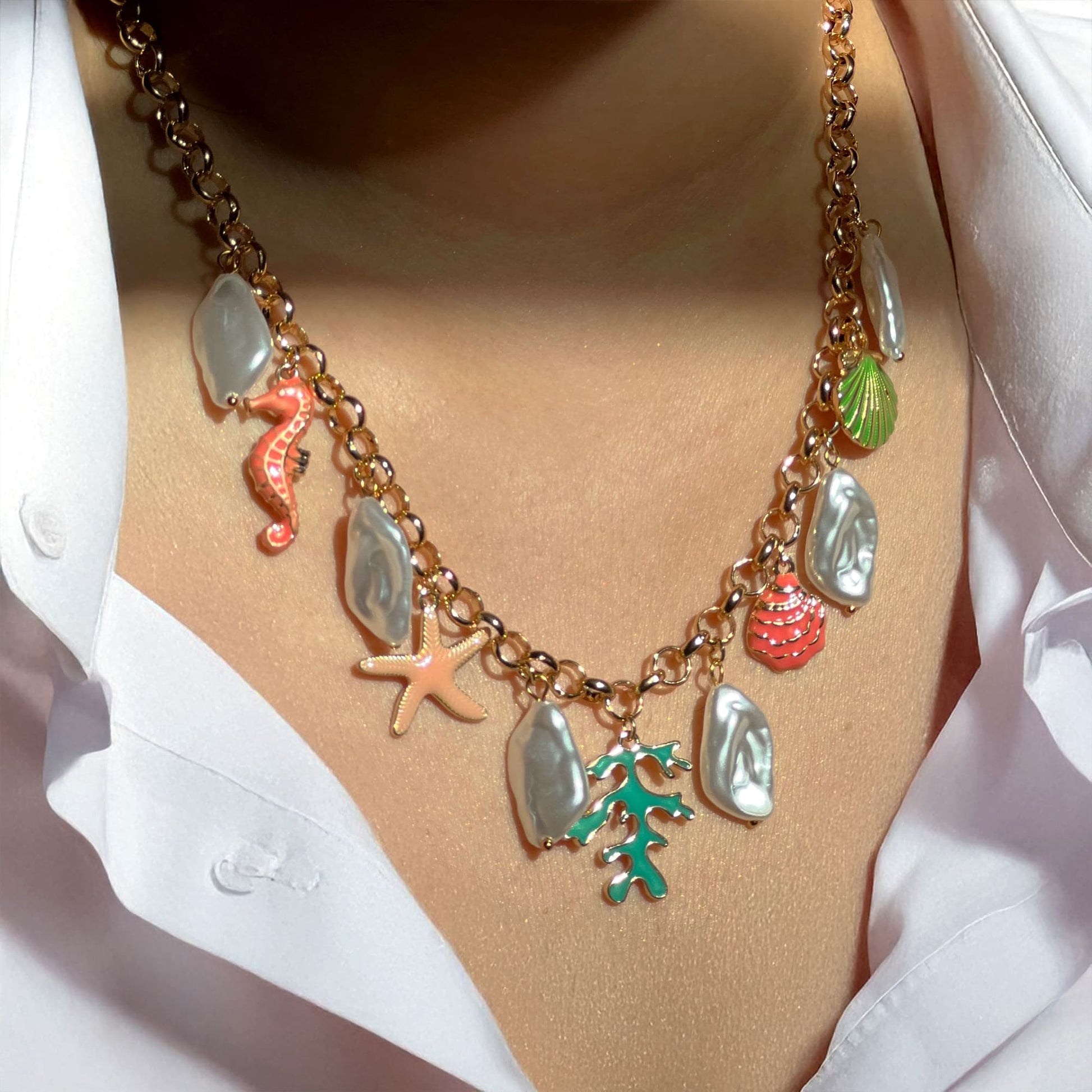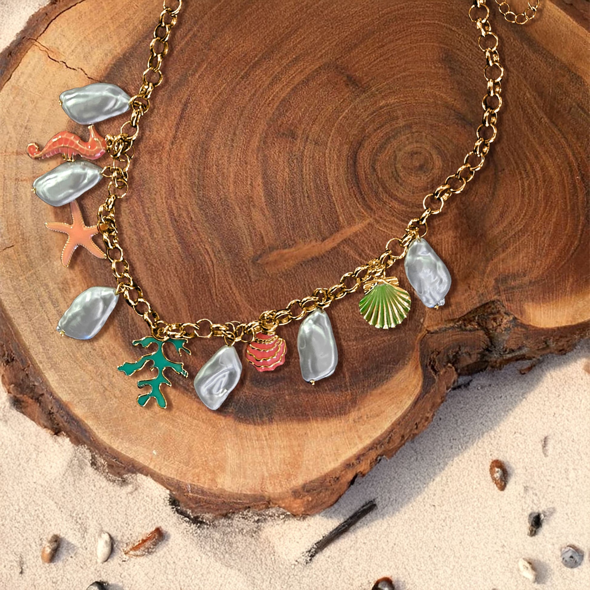 Dive into beachy vibes with our Beaded Summer Sea Charm Necklace. This playful piece features a mix of ocean-inspired charms, including a coral branch, delicate shells, a charming seahorse, and irregular pearls, all strung on a strand of colourful beads.