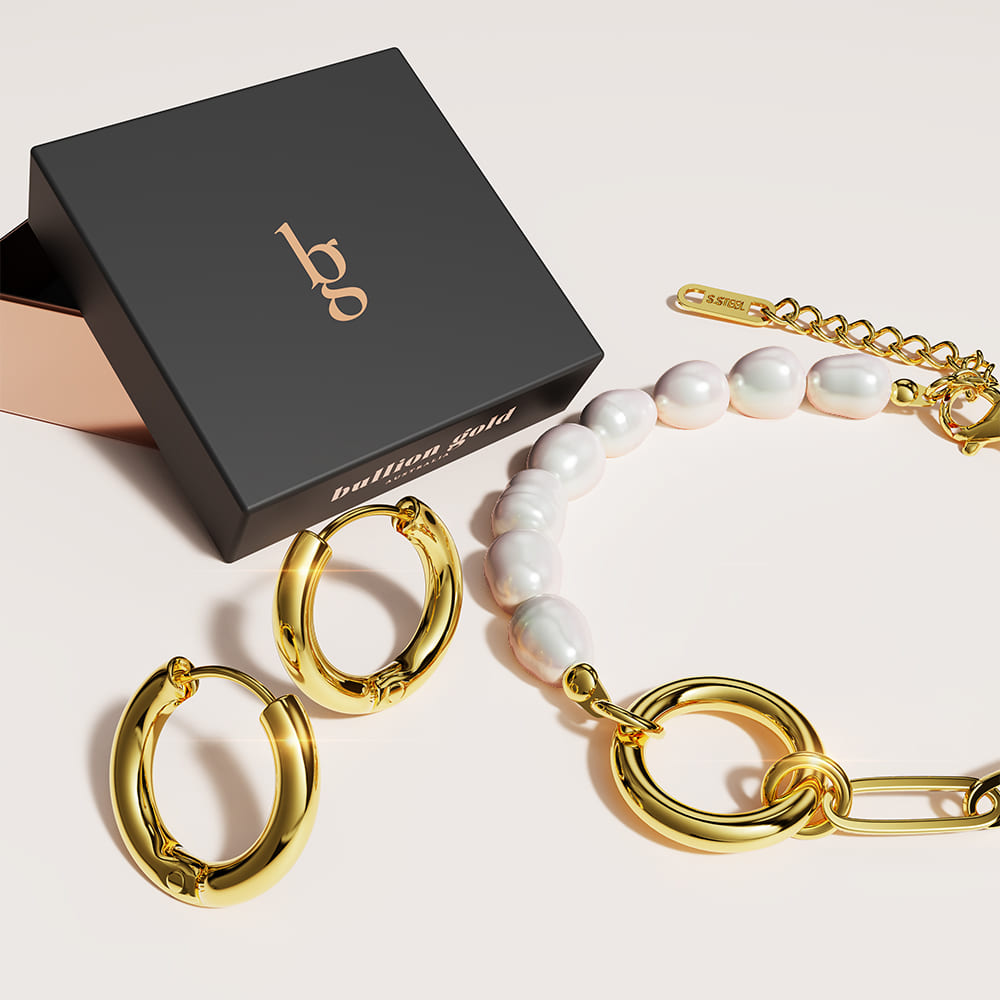 Say hello to a fresh look of the modern jewellery! With an asymmetrical appearance, this bracelet and earrings set features a dazzling mix of freshwater baroque pearls bracelet and gold earrings, this is one jewellery set that will surely conquer your heart. Wear on and shine in style!