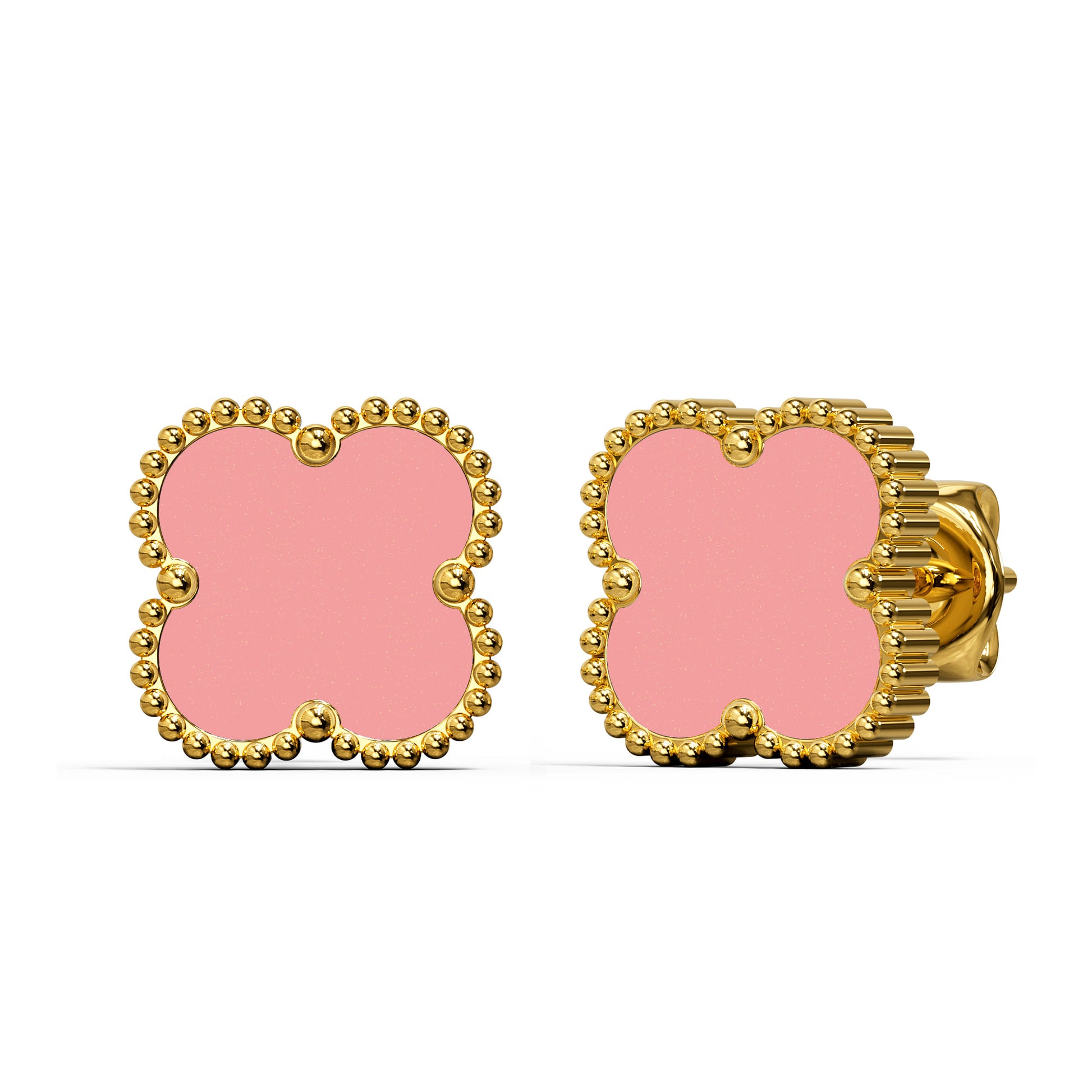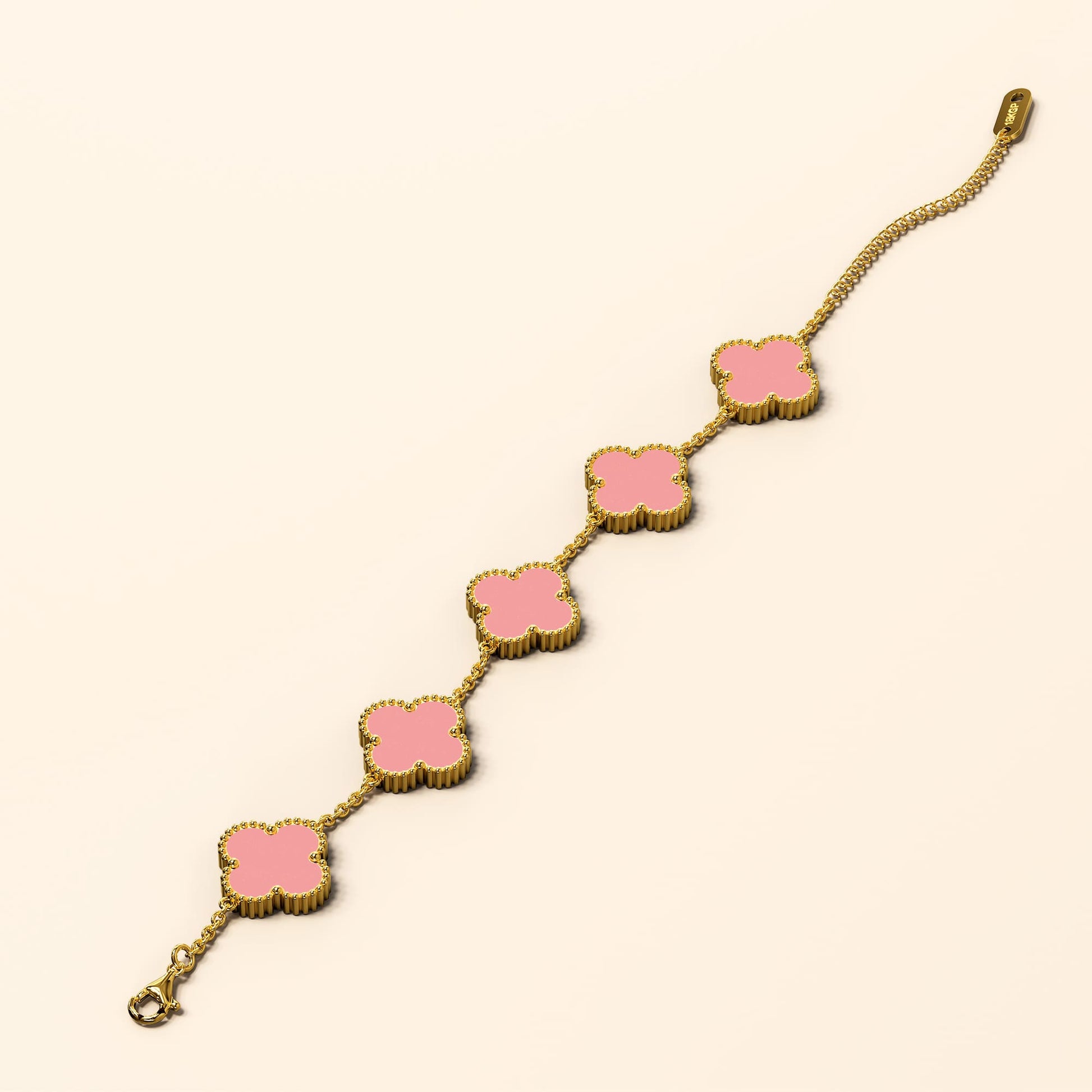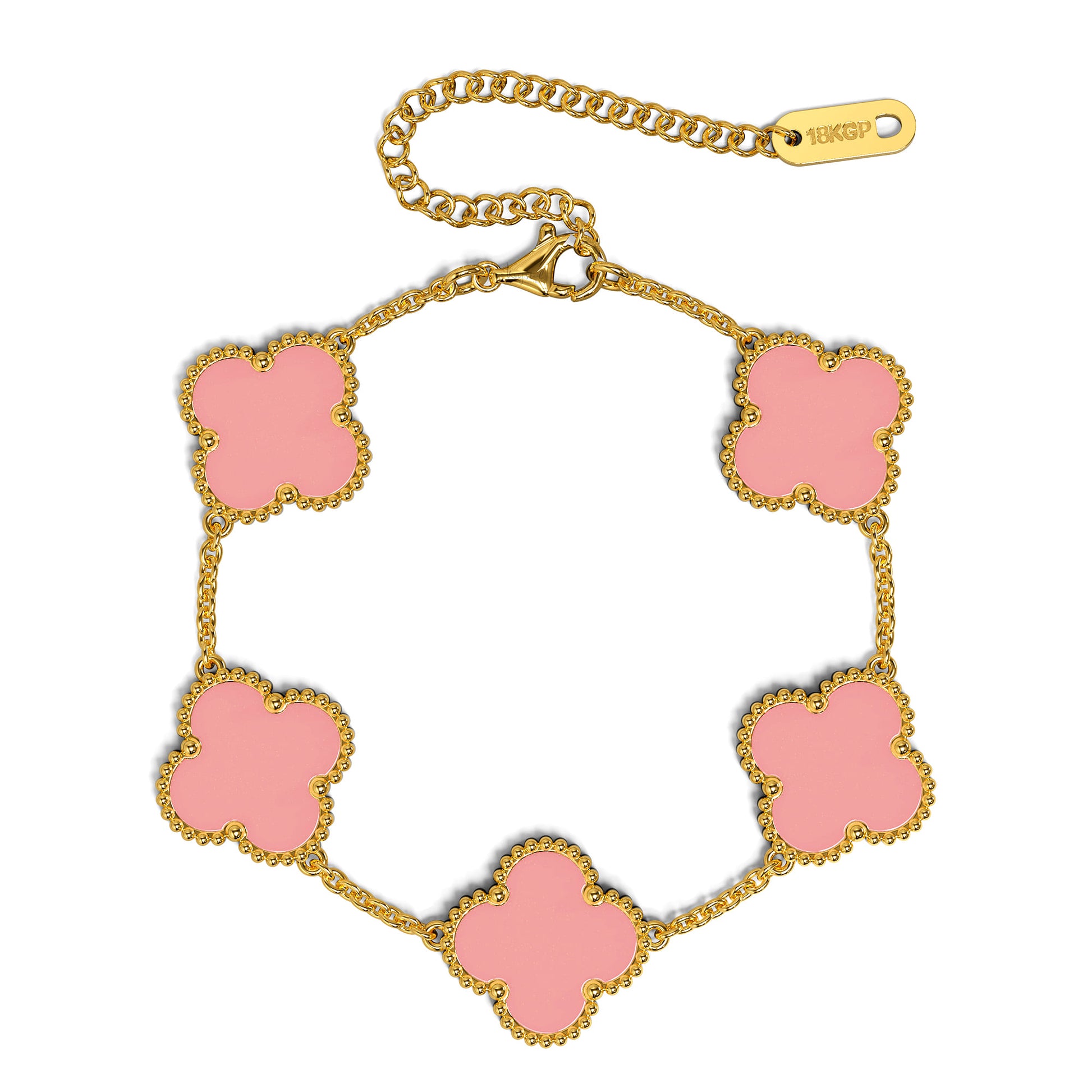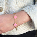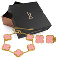 Discover this charming Boxed Pink Clover Bracelet and Earrings Set. This delightful set showcases a delicate clover shaped charm in a soft pink hue, symbolizing luck and good fortune. The bracelet and earrings are crafted with 18K gold plating, lending a touch of luxury. Beautifully packaged, this set is a perfect gift or a treat for yourself.