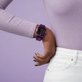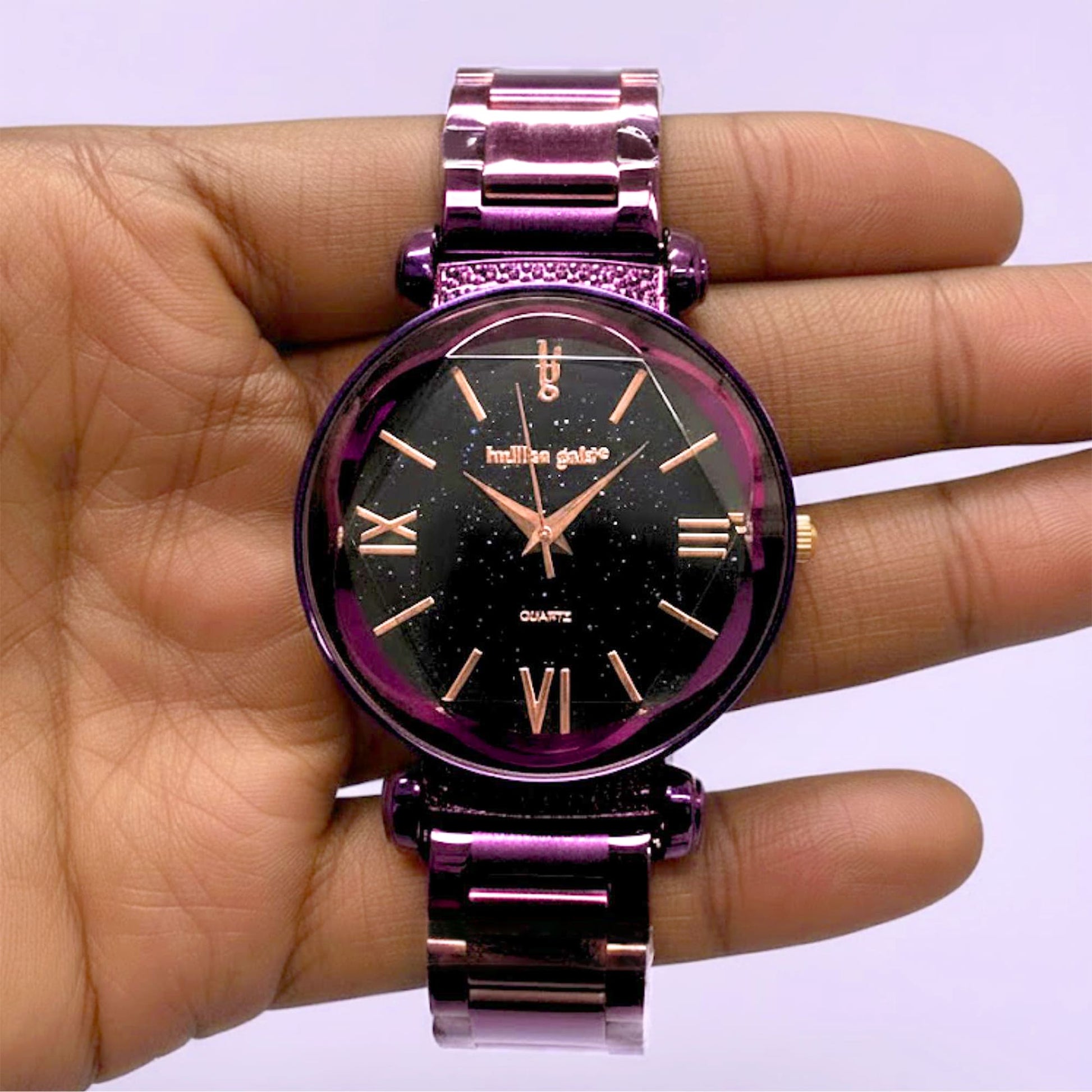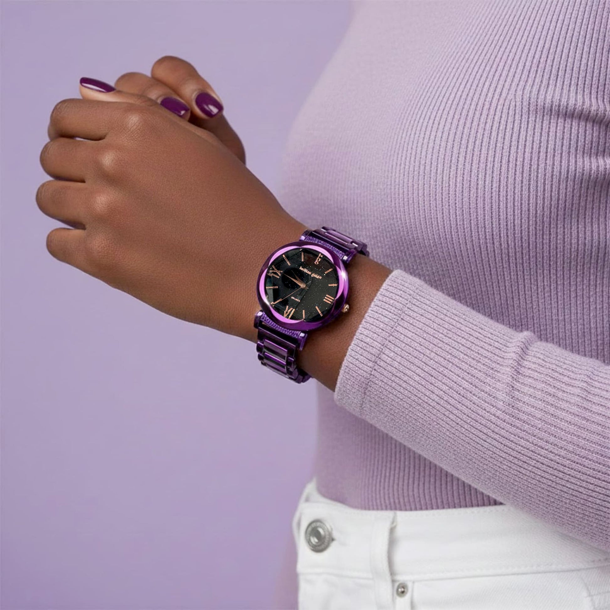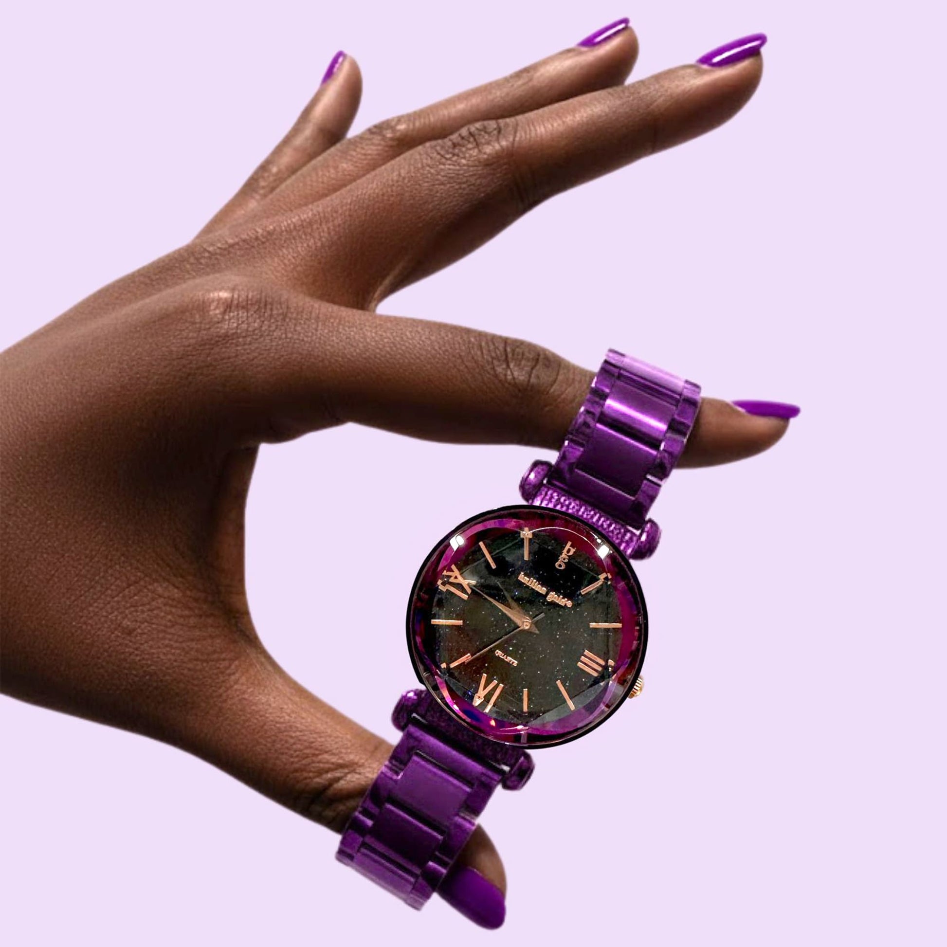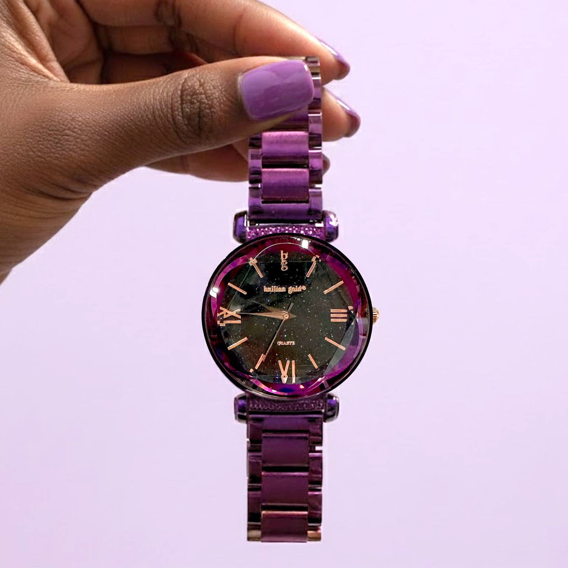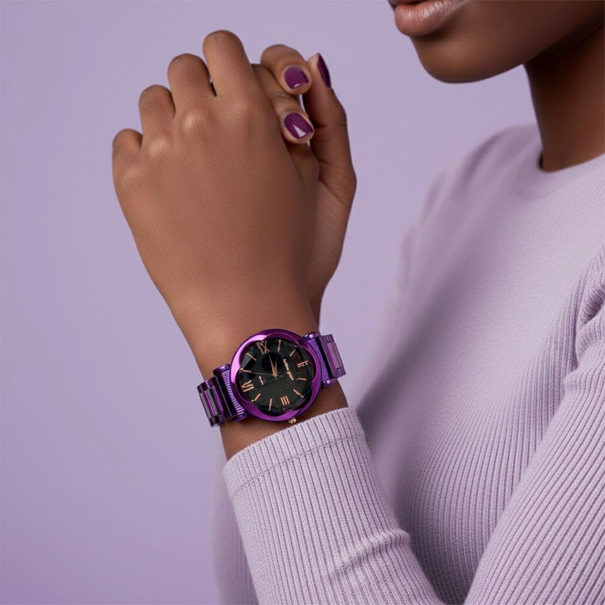Bullion Gold Romish Watch Embellished with Glittering Crystals - Purple and Black