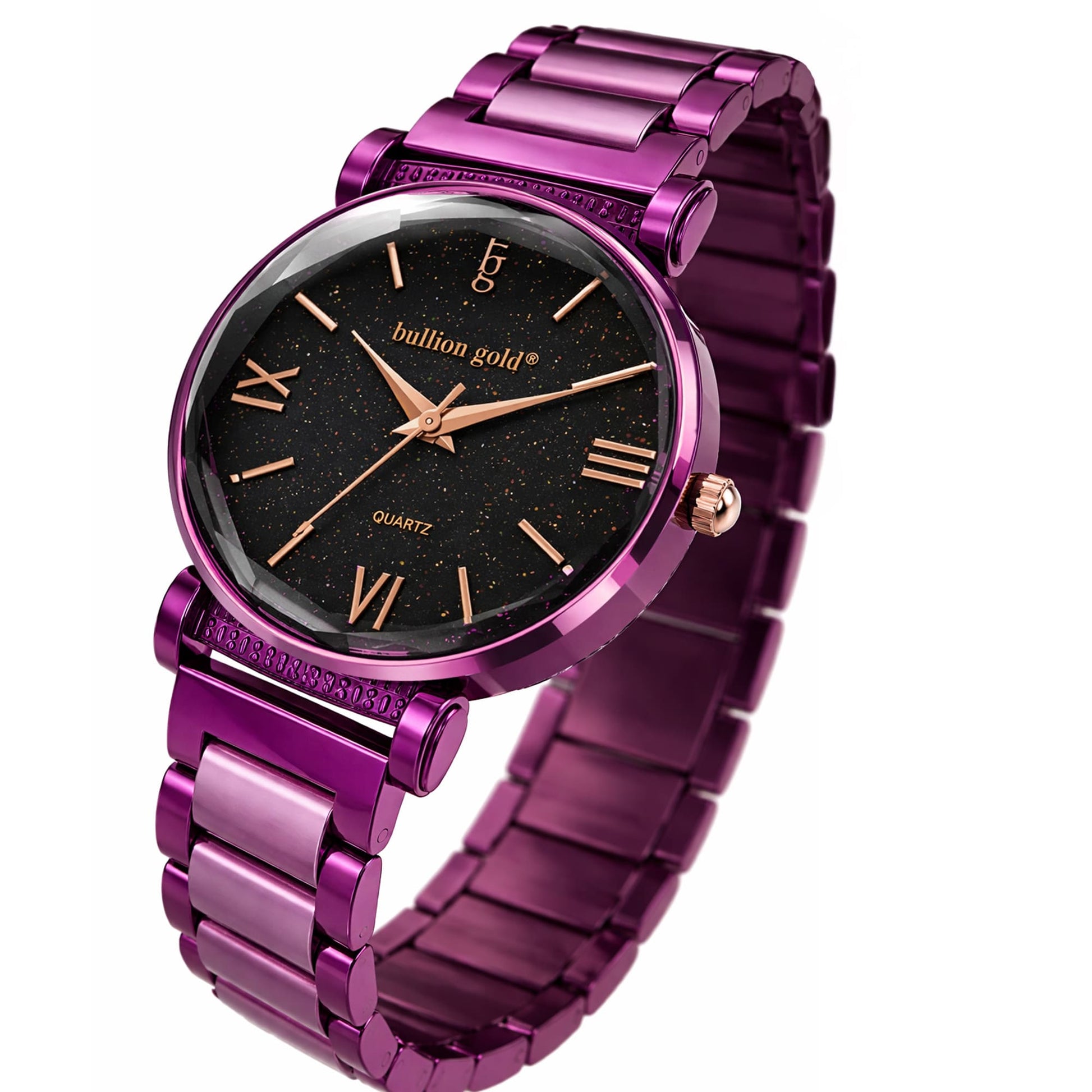 Introducing the Bullion Gold Romish Watch - a high-quality & timepiece that's perfect for discerning individuals. Made with precision Miyota movement and mineral reinforced glass and embellished with rhinestone, this watch is tough and resilient. And with its luxurious Purple and Black design, this classic beauty will make a bold statement wherever you go. So if you're in the hunt for an eye-catching chronograph that will last a lifetime, the Bullion Gold Chronograph is the perfect choice.