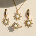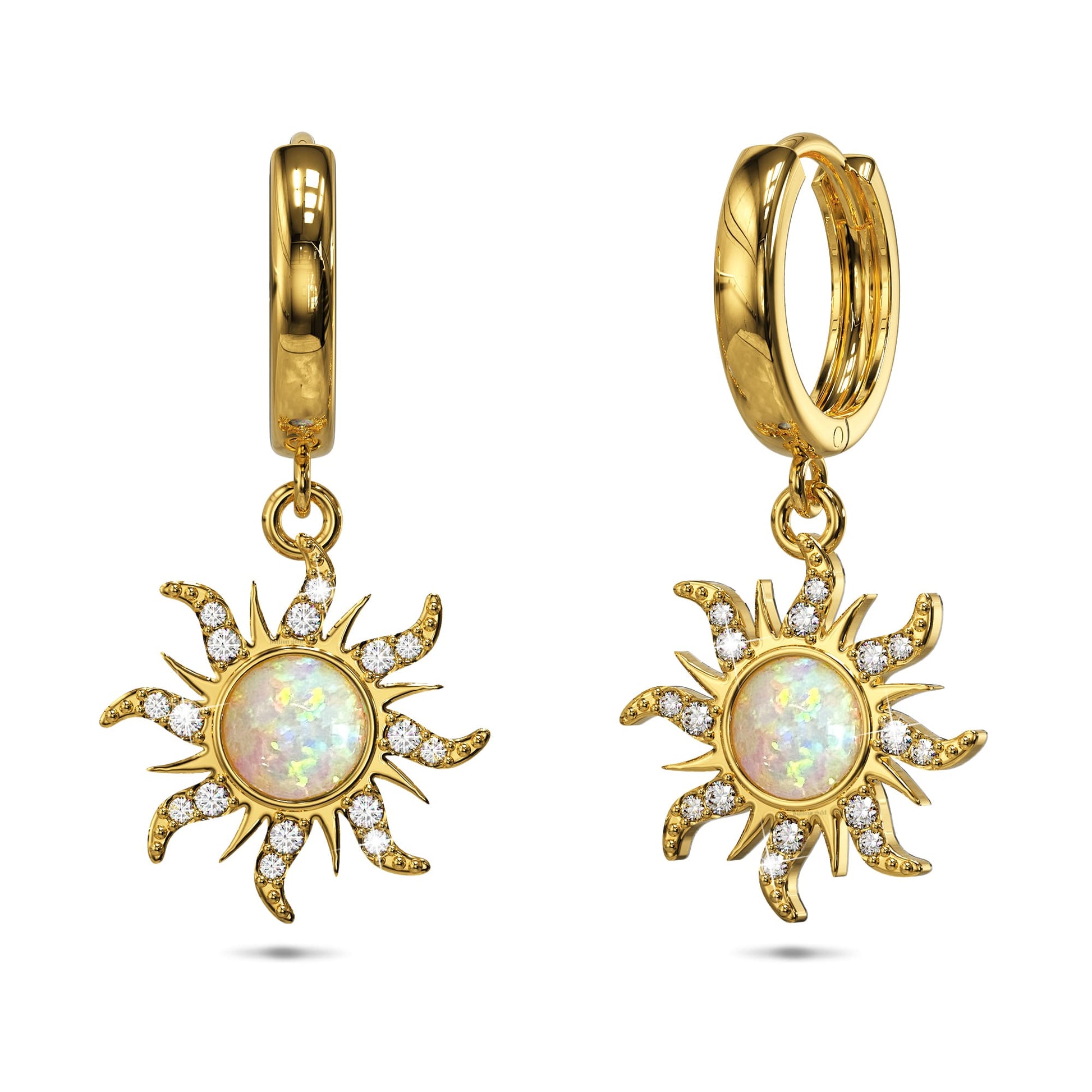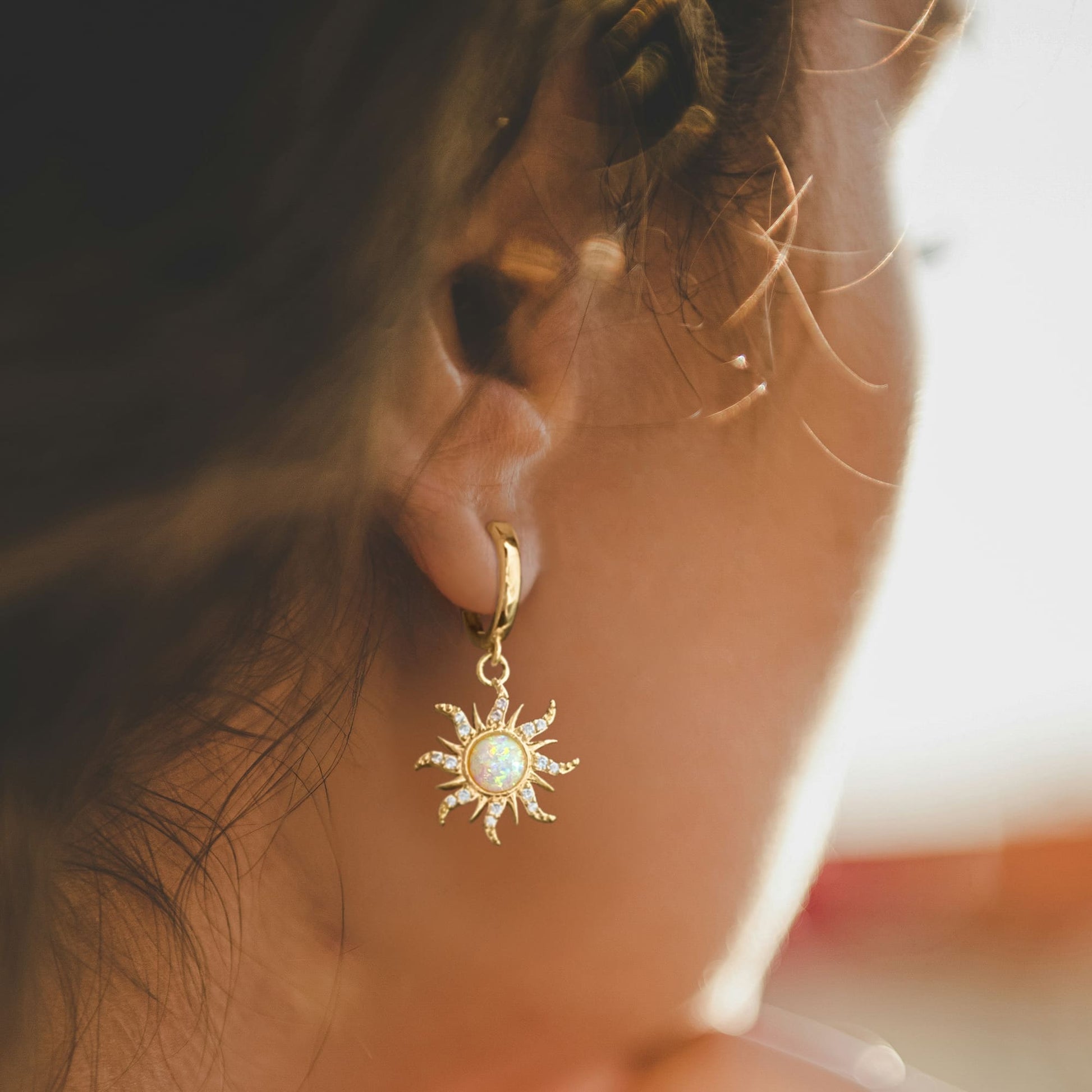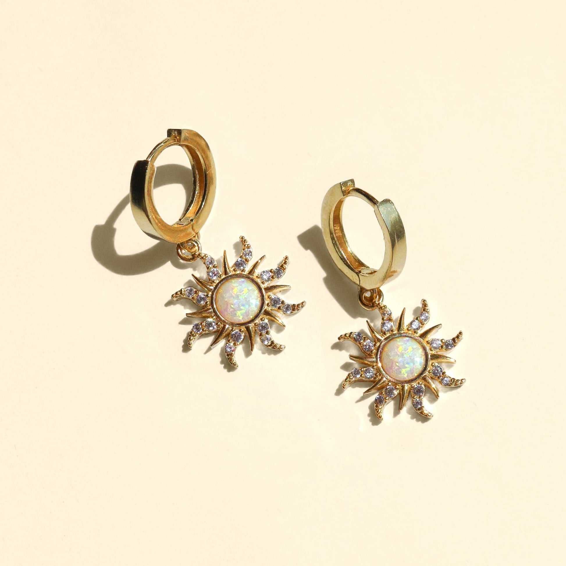 Shine with cosmic elegance and radiant charm with our Celestial Opal Sun Drop Earrings. Each earring features a glowing white opal encased in a delicate sunburst design, suspended to create a graceful and eye-catching silhouette. Perfect for elevating your everyday look or making a statement on special occasions, the Celestial Opal Sun Drop Earrings bring a touch of celestial magic to any outfit.