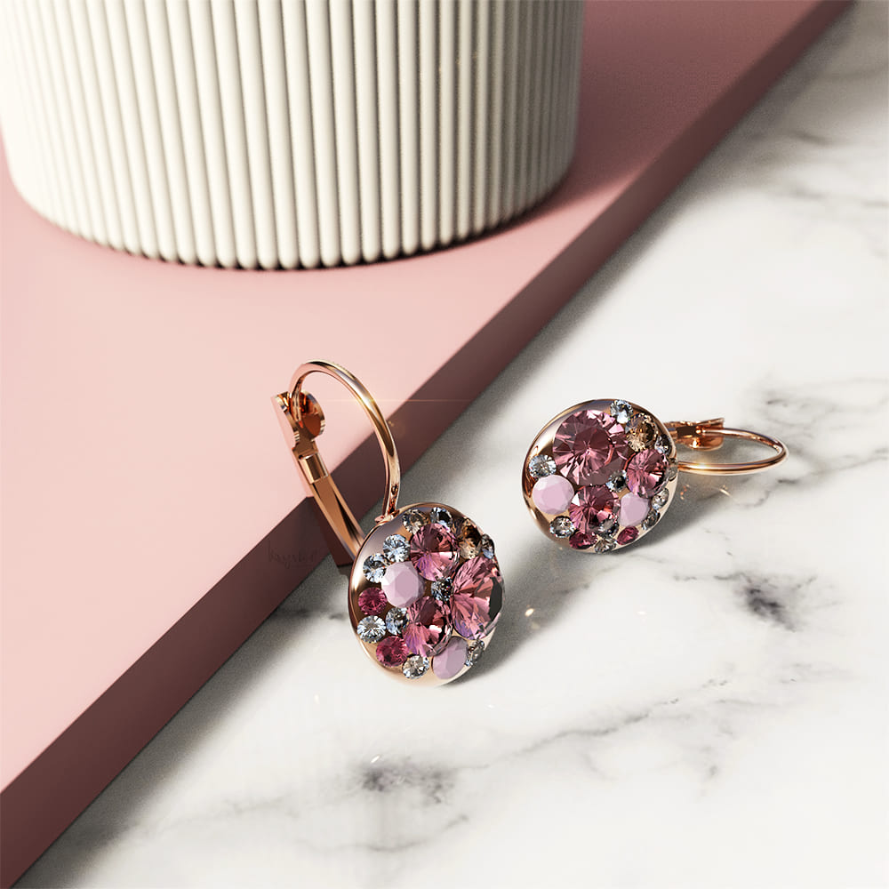 Exotic and magical! Plated with 18ct Rose Gold highlighting clustered multicolour Austrian Crystals for a simply lavish look. Perfect for a dinner or night event, these earrings will catch the night light and beam into anyone's eyes.