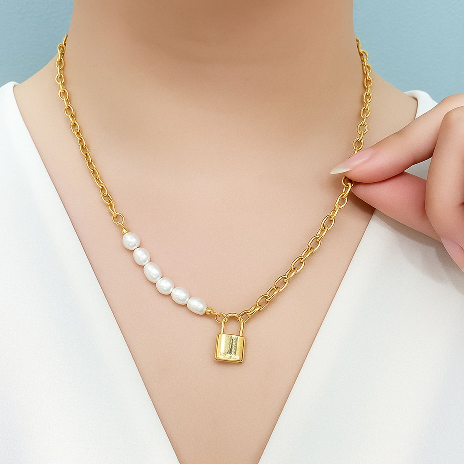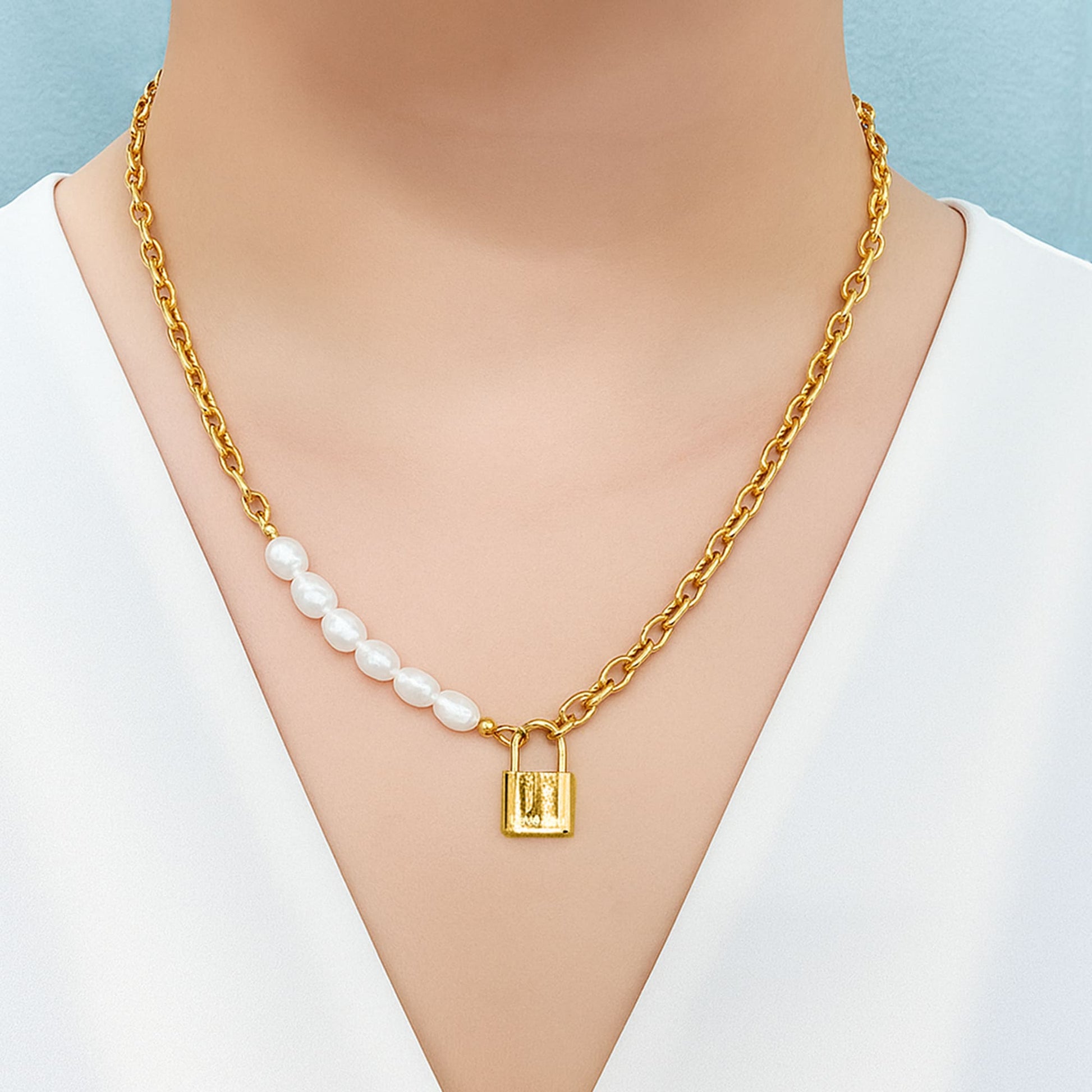 Our new collection of Elinor Freshwater Baroque Pearls Lock-Pendant Necklace is here to take your jewellery game to the next level. Complemented by row of freshwater baroque pearls and a lock pendant, this piece brings you a flattering and stunning look.