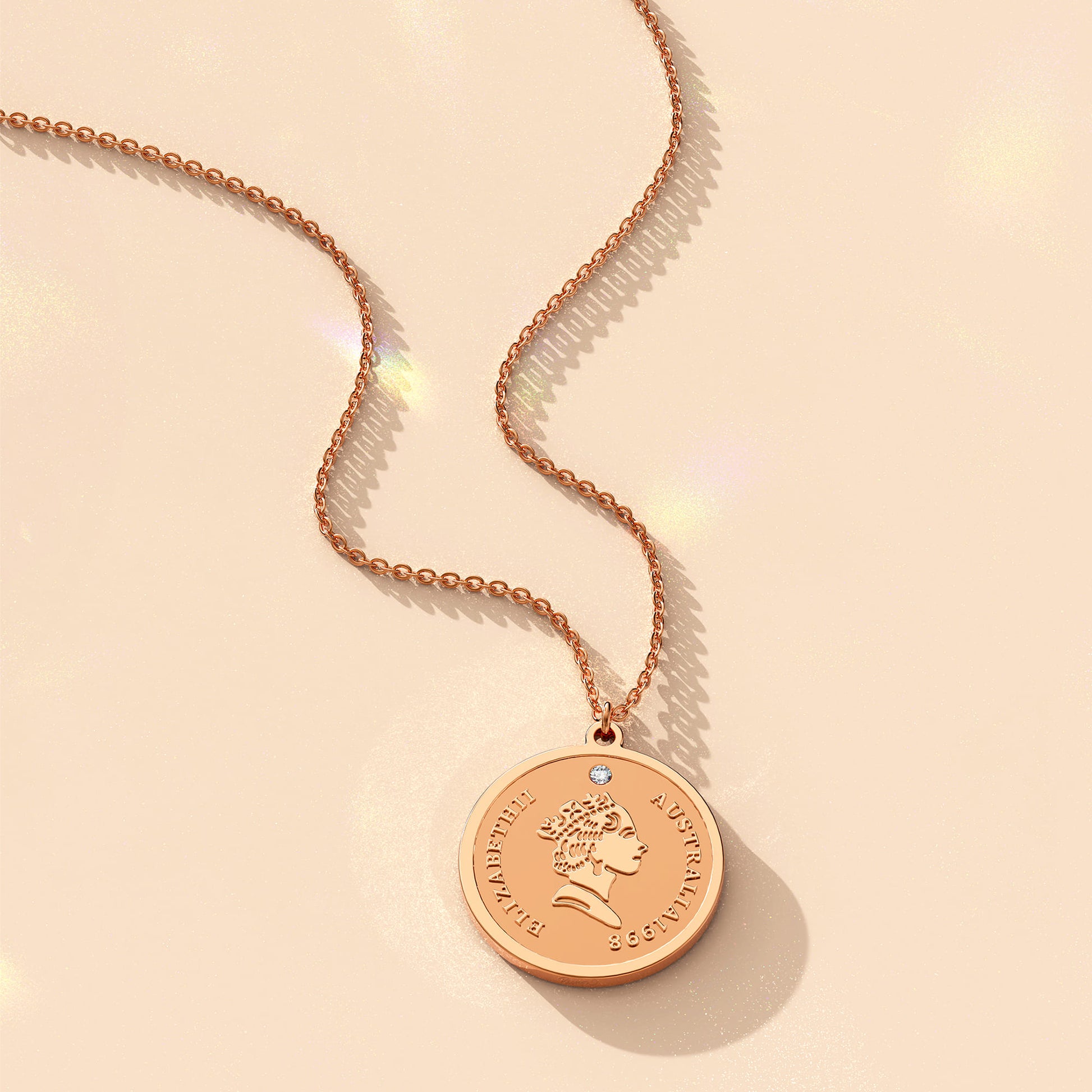 Fit for modern royalty, the Queen E Medallion Necklace captures the grace and strength of a true queen. Designed in gleaming rose gold plated titanium, this elegant piece features an Australian coin medallion pendant depicting Queen Elizabeth II, accented with a genuine 0.005ct diamond for a subtle touch of brilliance. Sophisticated and empowering, it’s a timeless statement of elegance—perfect for those who carry themselves with quiet confidence and refined charm.