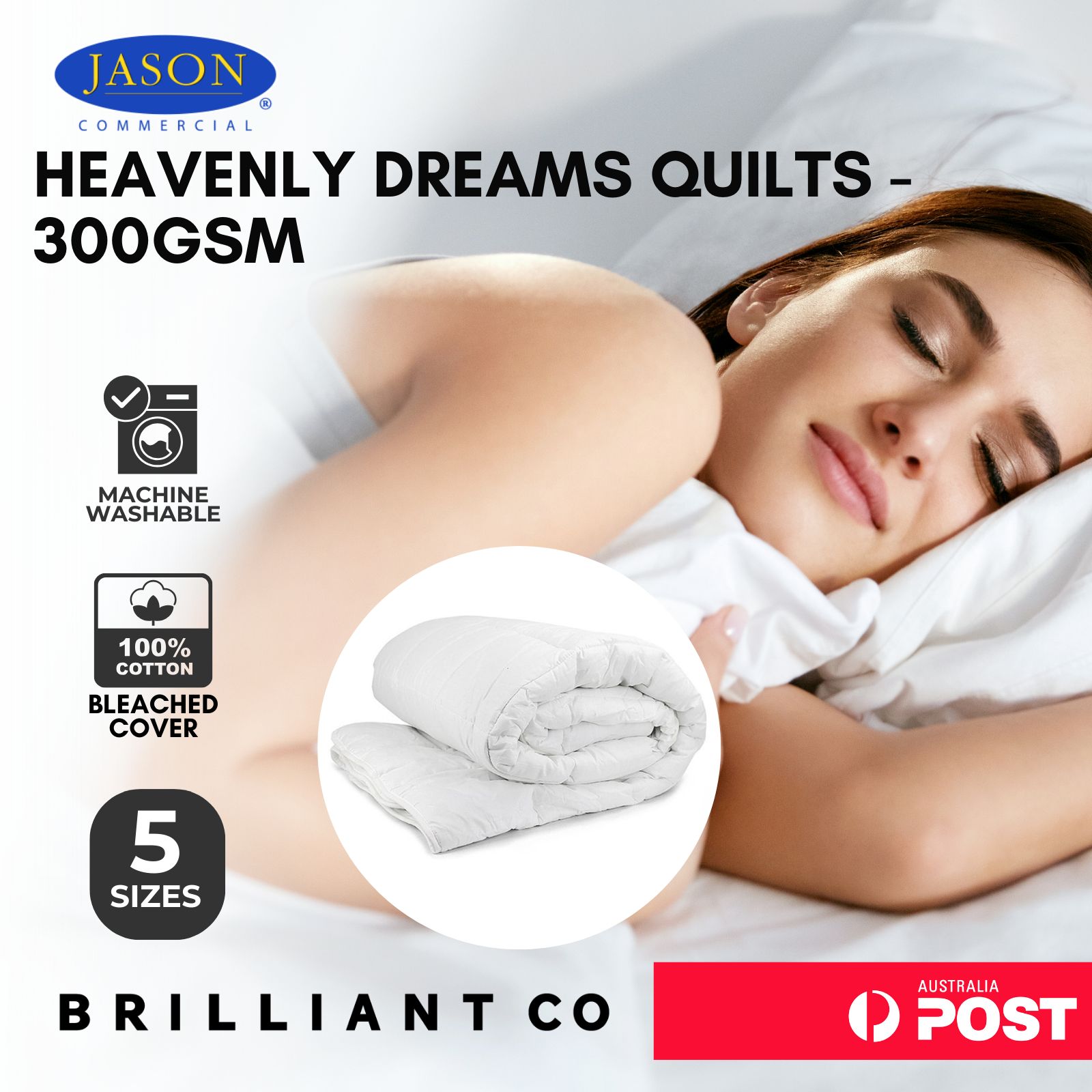 Heavenly Dreams Quilts are made for commercial laundering. This means they are more durable that your ordinary made-for-home bedding. The luxurious Heavenly Dreams Quilts range features 100% Bleached cotton cover. Enjoy commercial hotel quality bedding at affordable prices.