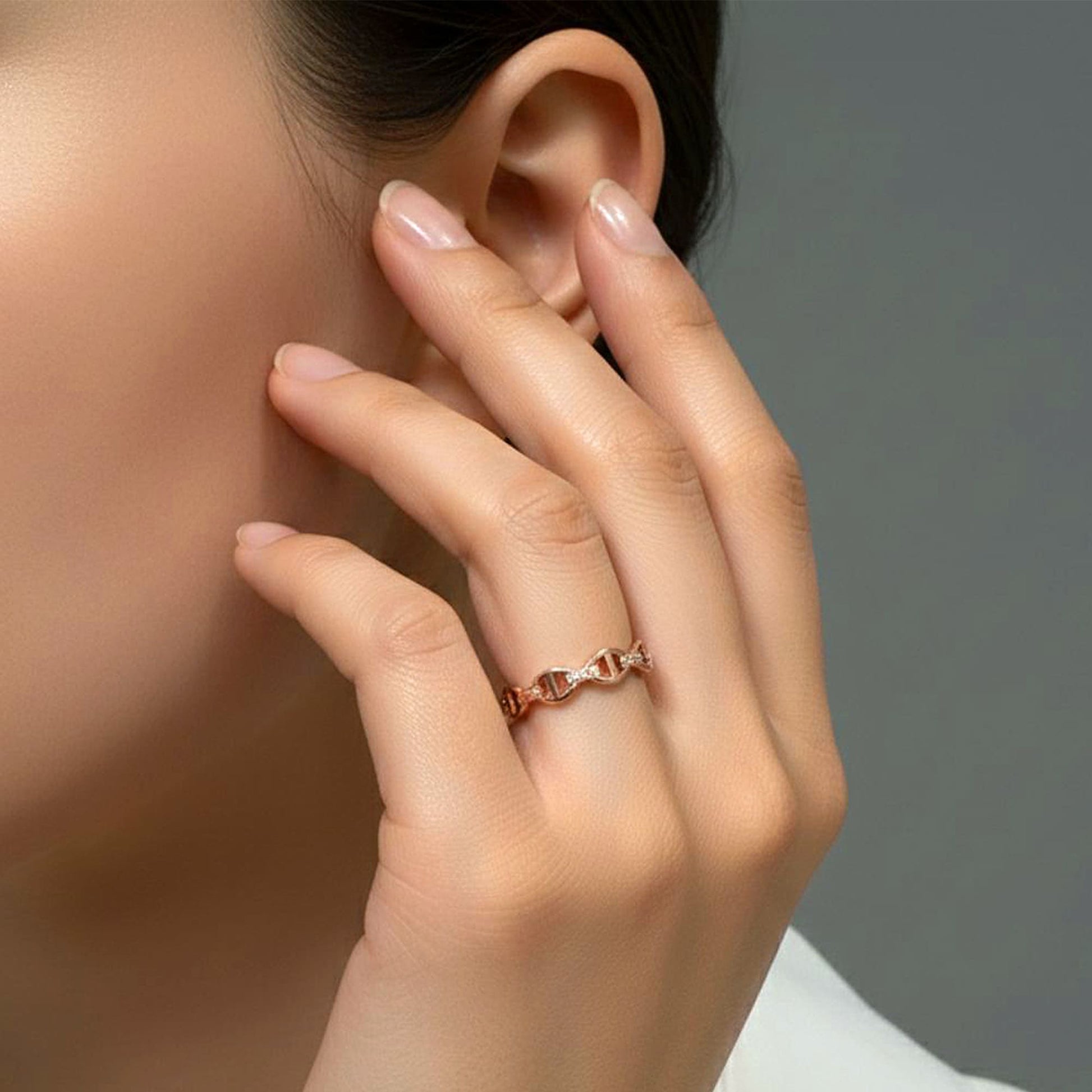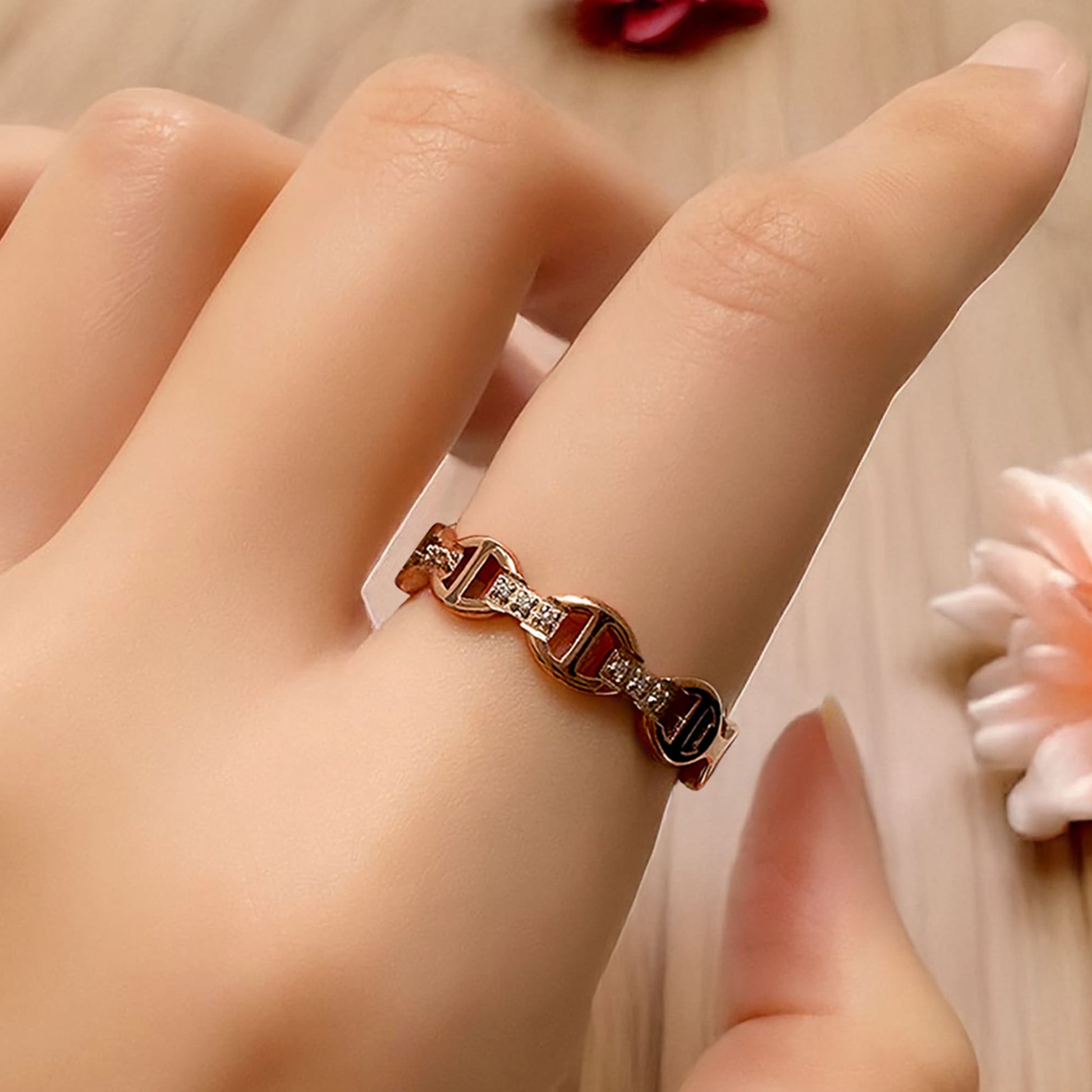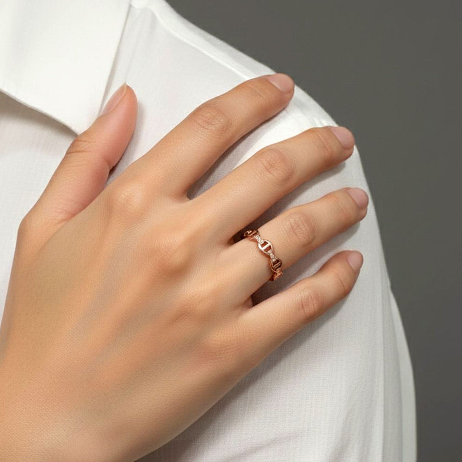 Get your hands on the exquisite Mariner Link Ring in Rose Gold, perfect for stacking and boasting 18k gold plating. This must-have piece effortlessly embodies style and sophistication. Ideal for any occasion.