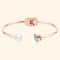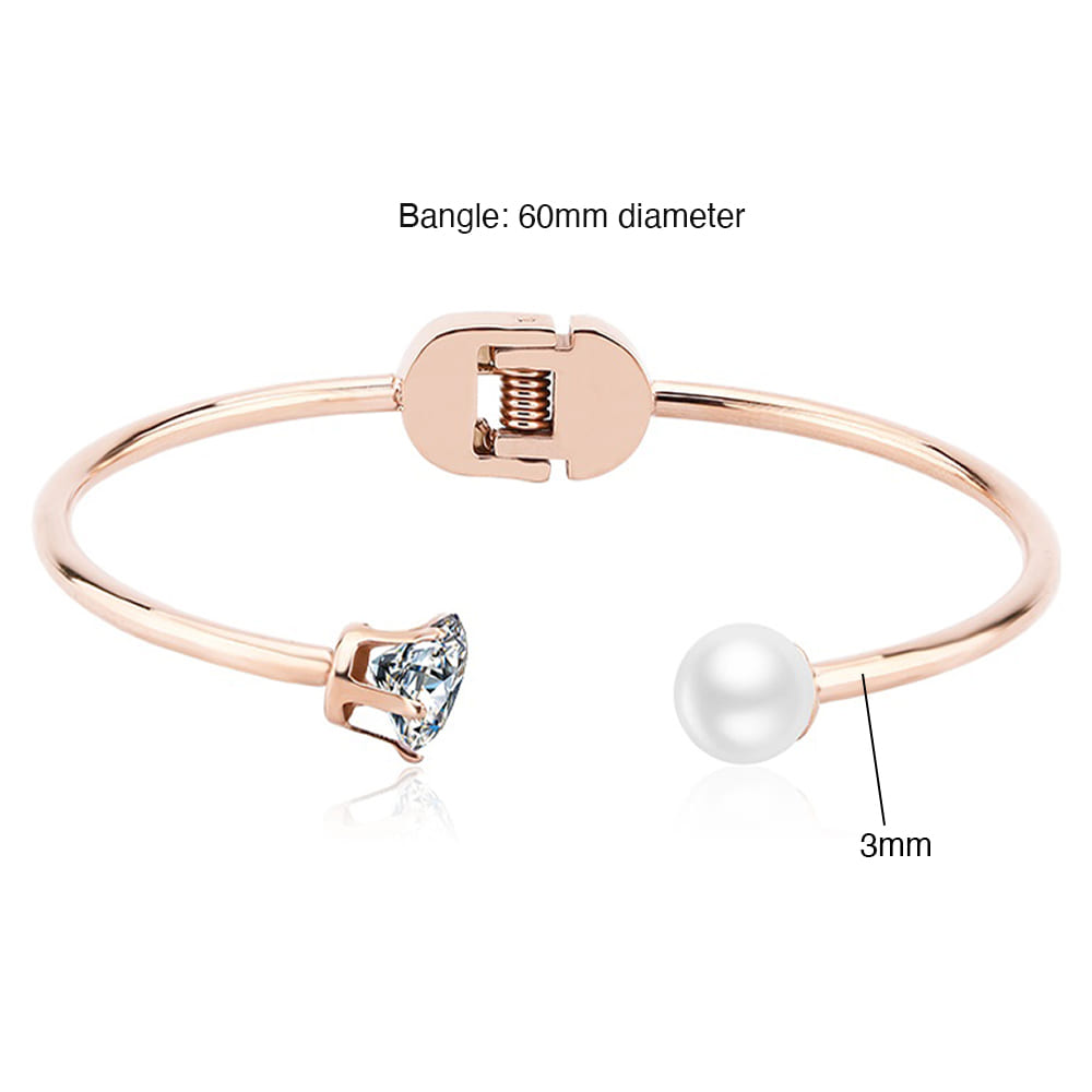 Elegant and sophisticated, this open bangle flaunts a flawless pearl and a brilliant cubic zirconia set on each end of the bangle. Made of 18K Rose Gold layered stainless steel, this hinged bangle is perfect for special occasions.
